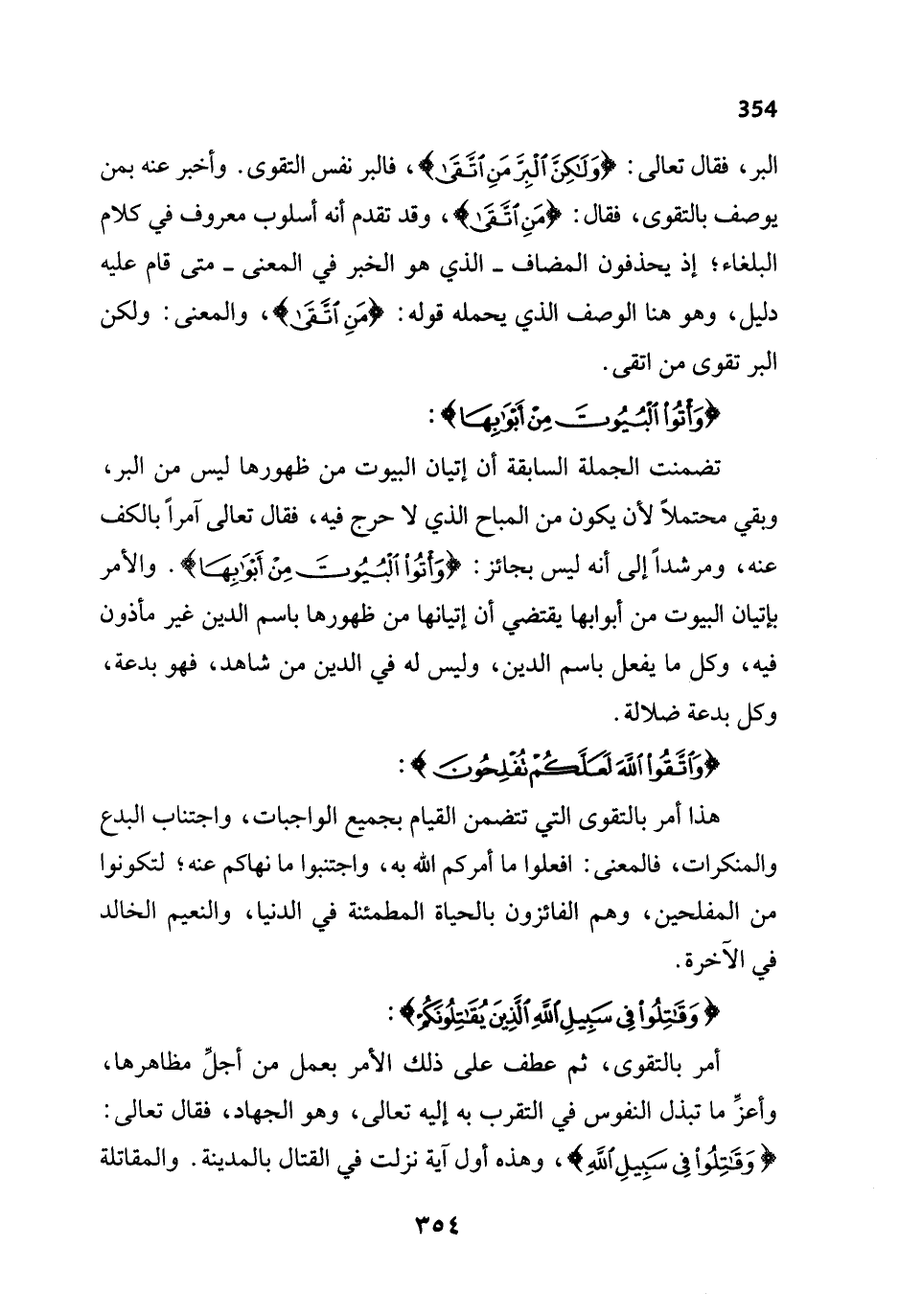 تضمنت الجملة السابقة أن إتيان البيوت من ظهورها ليس من البر، وبقي محتملاً لأن يكون من المباح الذي لا حرج فيه، فقال تعالى آمراً بالكف عنه، ومرشداً إلى أنه ليس بجائز: {وَأْتُوا الْبُيُوتَ مِنْ أَبْوَابِهَا}. والأمر بإتيان البيوت من أبوابها يقتضي أن إتيانها من ظهورها باسم الدين غير مأذون فيه، وكل ما يفعل باسم الدين، وليس له في الدين من شاهد، فهو بدعة، وكل بدعة ضلالة.