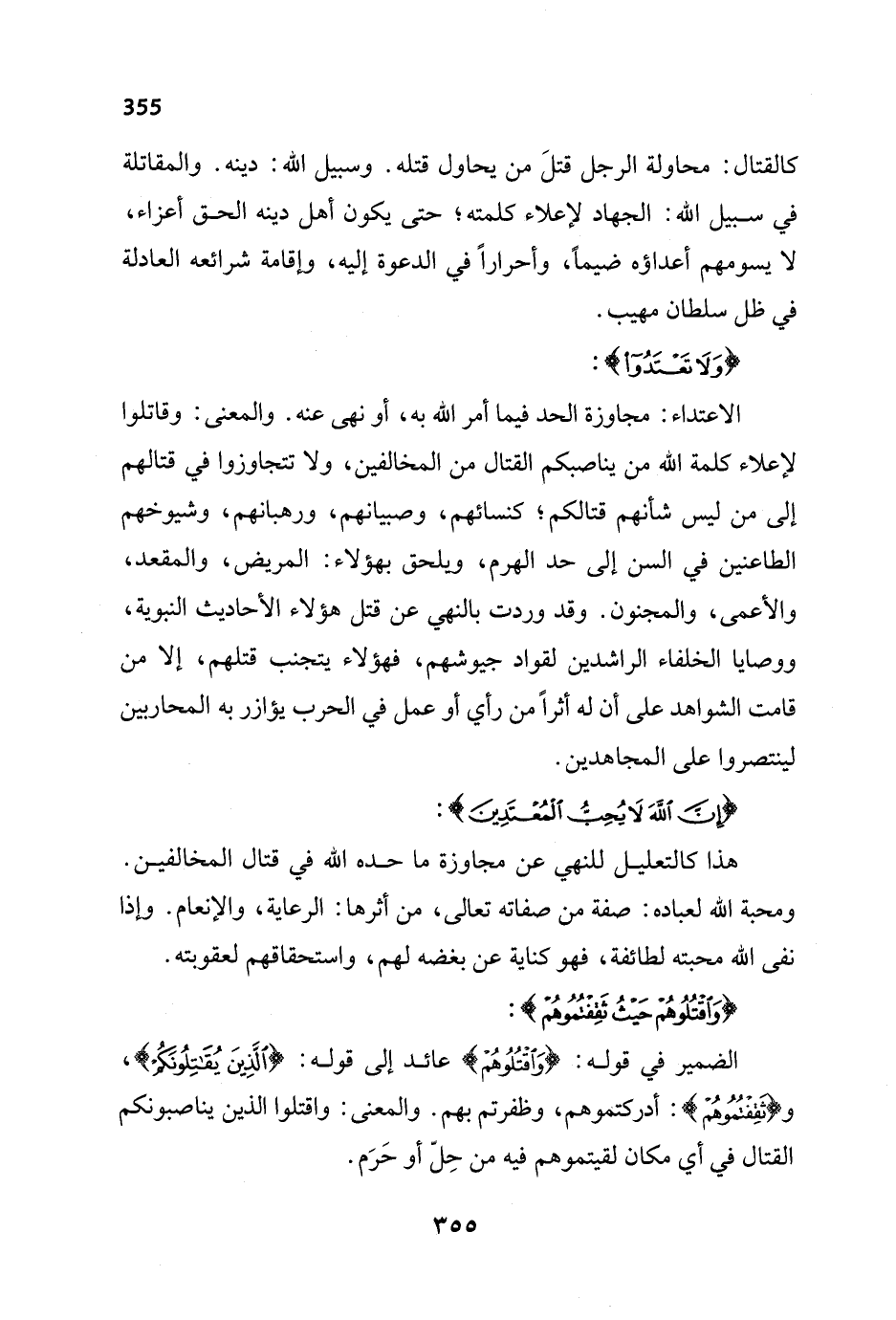 الاعتداء: مجاوزة الحد فيما أمر الله به، أو نهى عنه. والمعنى: وقاتلوا لإعلاء كلمة الله من يناصبكم القتال من المخالفين، ولا تتجاوزوا في قتالهم إلى من ليس شأنهم قتالكم؛ كنسائهم، وصبيانهم، ورهبانهم، وشيوخهم الطاعنين في السن إلى حد الهرم، ويلحق بهؤلاء: المريض، والمقعد، والأعمى، والمجنون. وقد وردت بالنهي عن قتل هؤلاء الأحاديث النبوية، ووصايا الخلفاء الراشدين لقواد جيوشهم، فهؤلاء يتجنب قتلهم، إلا من قامت الشواهد على أن له أثراً من رأي أو عمل في الحرب يؤازر به المحاربين لينتصروا على المجاهدين.