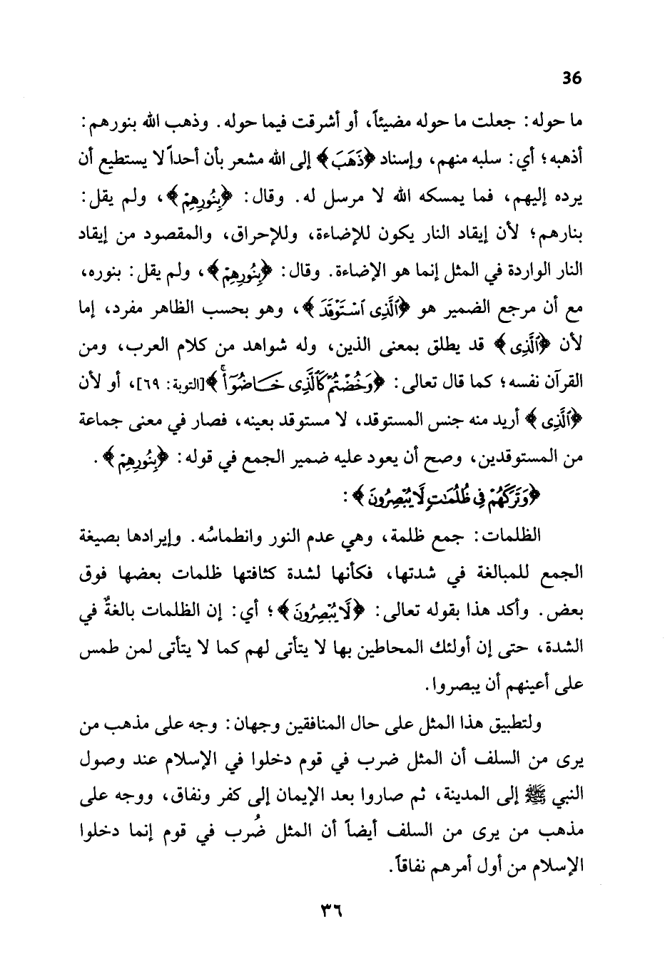 ما حوله: جعلت ما حوله مضيئاً، أو أشرقت فيما حوله. وذهب الله بنورهم: أذهبه؛ أي: سلبه منهم، وإسناد {ذَهَبَ} إلى الله مشعر بان أحداً لا يستطيع أن يرده إليهم، فما يمسكه الله لا مرسل له. وقال: {بِنُورِهِمْ}، ولم يقل: بنارهم؛ لأن إيقاد النار يكون للإضاءة، وللإحراق، والمقصود من إيقاد النار الواردة في المثل إنما هو الإضاءة. وقال: {بِنُورِهِمْ}، ولم يقل: بنوره، مع أن مرجع الضمير هو {الَّذِي اسْتَوْقَدَ}، وهو بحسب الظاهر مفرد، إما لأن {الَّذِي} قد يطلق بمعنى الذين، وله شواهد من كلام العرب، ومن القرآن نفسه؛ كما قال تعالى: {وَخُضْتُمْ كَالَّذِي خَاضُوا} [التوبة: 69]، أو لأن {الَّذِي} أريد منه جنس المستوقد، لا مستوقد بعينه، فصار في معنى جماعة من المستوقدين، وصح أن يعود عليه ضمير الجمع في قوله: {بِنُورِهِمْ}.