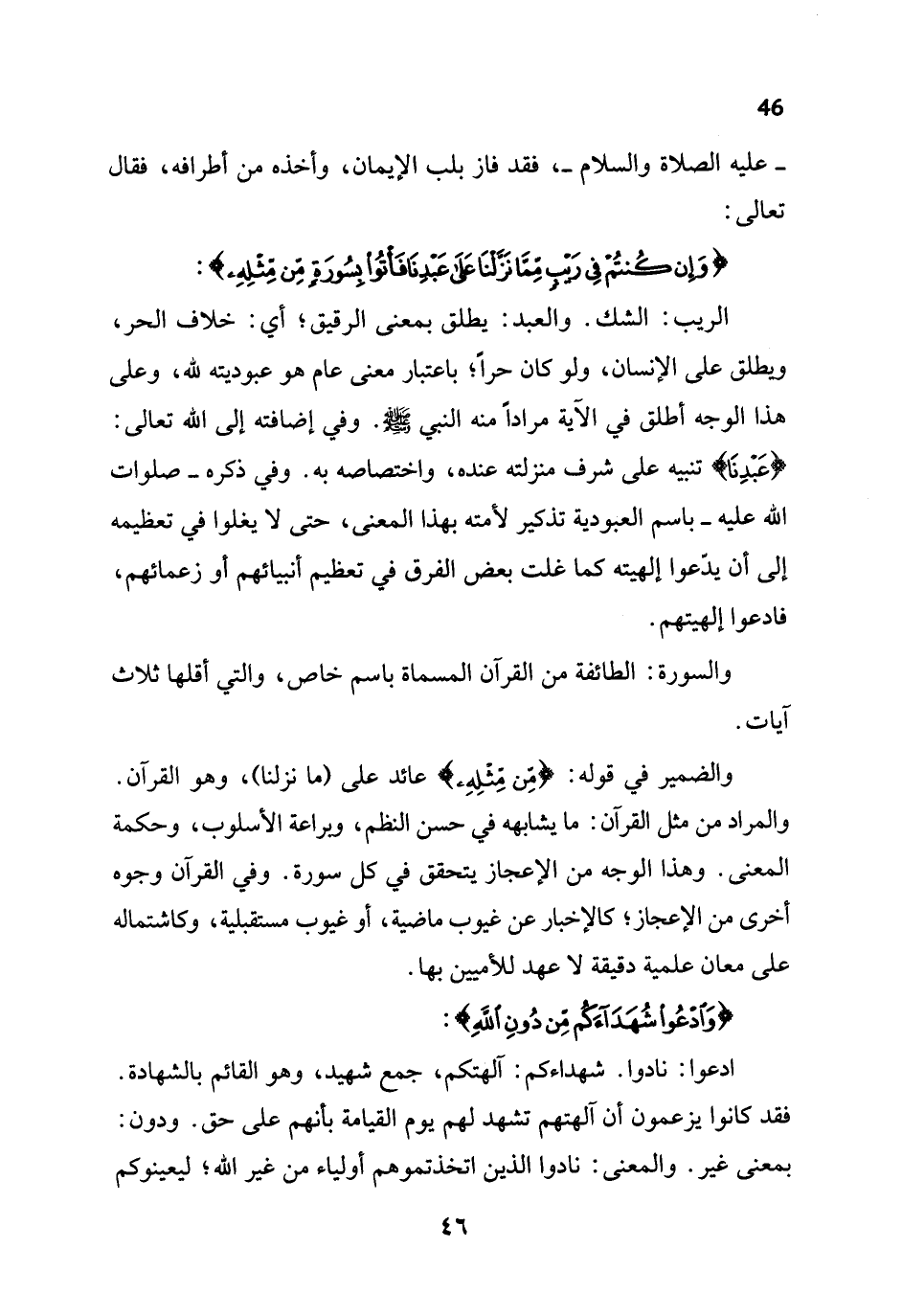 والضمير في قوله: {مِنْ مِثْلِهِ} عائد على (ما نزلنا)، وهو القرآن. والمراد من مثل القرآن: ما يشابهه في حسن النظم، وبراعة الأسلوب، وحكمة المعنى. وهذا الوجه من الإعجاز يتحقق في كل سورة. وفي القرآن وجوه أخرى من الإعجاز؛ كالإخبار عن غيوب ماضية، أو غيوب مستقبلية، وكاشتماله على معان علمية دقيقة لا عهد للأميين بها.