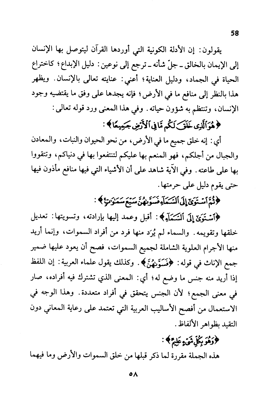 يقولون: إن الأدلة الكونية التي أوردها القرآن ليتوصل بها الإنسان إلى الإيمان بالخالق - جل شأنه - ترجع إلى نوعين: دليل الإبداع؛ كاختراع الحياة في الجماد، ودليل العناية؛ أعني: عنايته تعالى بالإنسان. ويظهر هذا بالنظر إلى منافع ما في الأرض؛ فإنه يجدها على وفق ما يقتضيه وجود الإنسان، وتنتظم به شؤون حياته. وفي هذا المعنى ورد قوله تعالى: