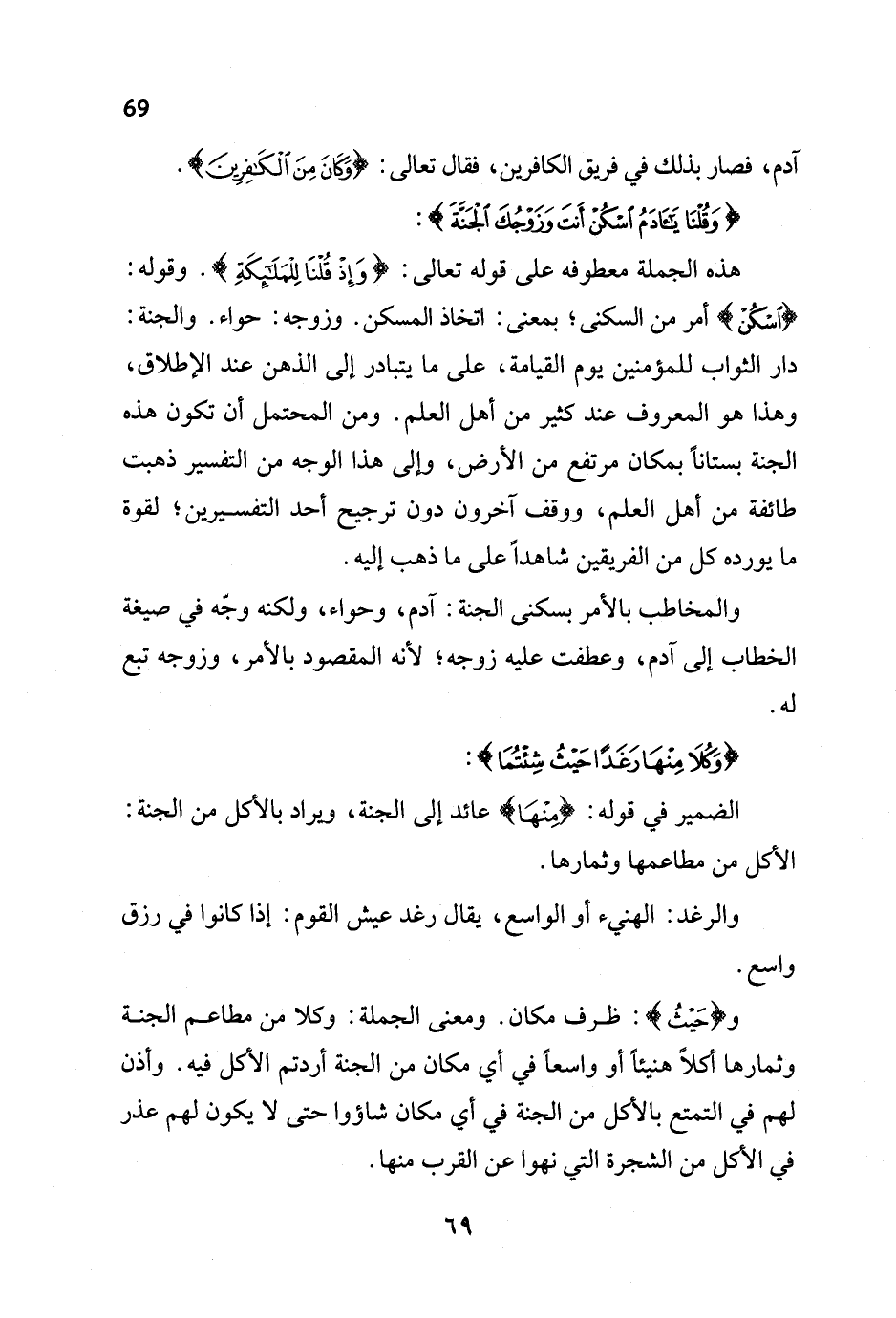 هذه الجملة معطوفه على قوله تعالى: {وَإِذْ قُلْنَا لِلْمَلَائِكَةِ}. وقوله: {اسْكُنْ} أمر من السكنى؛ بمعنى: اتخاذ المسكن. وزوجه: حواء. والجنة: دار الثواب للمؤمنين يوم القيامة، على ما يتبادر إلى الذهن عند الإطلاق، وهذا هو المعروف عند كثير من أهل العلم. ومن المحتمل أن تكون هذه الجنة بستاناً بمكان مرتفع من الأرض، وإلى هذا الوجه من التفسير ذهبت طائفة من أهل العلم، ووقف آخرون دون ترجيح أحد التفسيرين؛ لقوة ما يورده كل من الفريقين شاهداً على ما ذهب إليه.