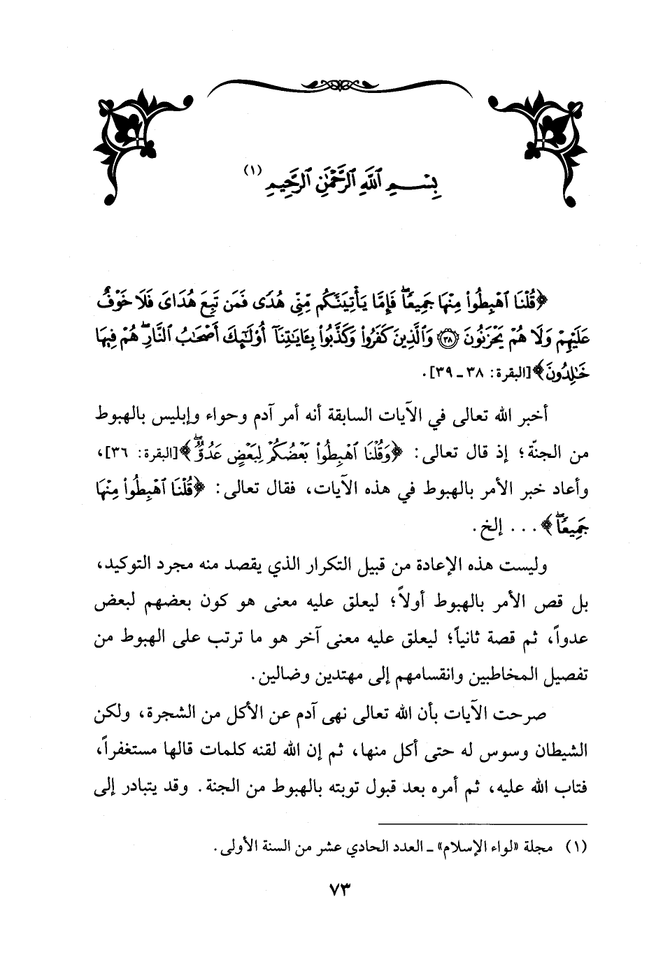 وليست هذه الإعادة من قبيل التكرار الذي يقصد منه مجرد التوكيد، بل قص الأمر بالهبوط أولاً؛ ليعلق عليه معنى هو كون بعضهم لبعض عدواً، ثم قصة ثانياً؛ ليعلق عليه معنى آخر هو ما ترتب على الهبوط من تفصيل المخاطبين وانقسامهم إلى مهتدين وضالين.