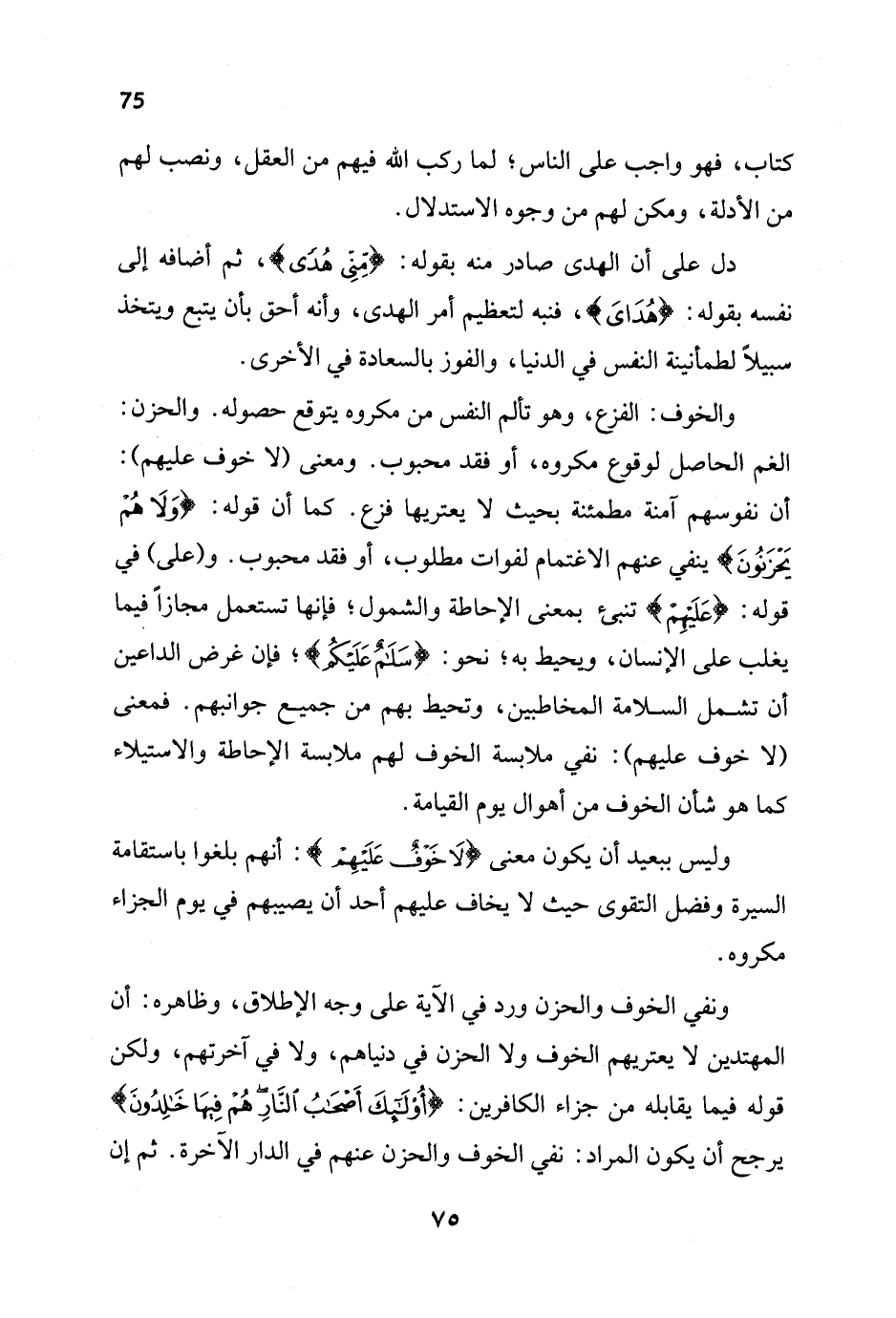 ونفي الخوف والحزن ورد في الآية على وجه الإطلاق، وظاهره: أن المهتدين لا يعتريهم الخوف ولا الحزن في دنياهم، ولا في آخرتهم، ولكن قوله فيما يقابله من جزاء الكافرين: {أُولَئِكَ أَصْحَابُ النَّارِ هُمْ فِيهَا خَالِدُونَ} يرجح أن يكون المراد: نفي الخوف والحزن عنهم في الدار الآخرة. ثم إن