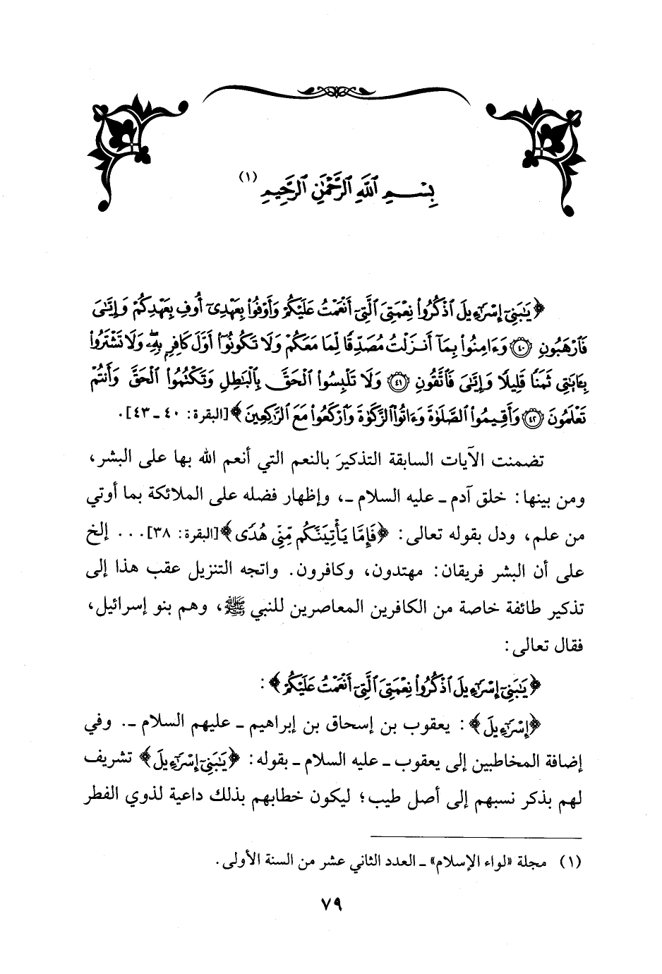 {يَابَنِي إِسْرَائِيلَ اذْكُرُوا نِعْمَتِيَ الَّتِي أَنْعَمْتُ عَلَيْكُمْ وَأَوْفُوا بِعَهْدِي أُوفِ بِعَهْدِكُمْ وَإِيَّايَ فَارْهَبُونِ (40) وَآمِنُوا بِمَا أَنْزَلْتُ مُصَدِّقًا لِمَا مَعَكُمْ وَلَا تَكُونُوا أَوَّلَ كَافِرٍ بِهِ وَلَا تَشْتَرُوا بِآيَاتِي ثَمَنًا قَلِيلًا وَإِيَّايَ فَاتَّقُونِ (41) وَلَا تَلْبِسُوا الْحَقَّ بِالْبَاطِلِ وَتَكْتُمُوا الْحَقَّ وَأَنْتُمْ تَعْلَمُونَ (42) وَأَقِيمُوا الصَّلَاةَ وَآتُوا الزَّكَاةَ وَارْكَعُوا مَعَ الرَّاكِعِينَ} [البقرة: 40 - 43].