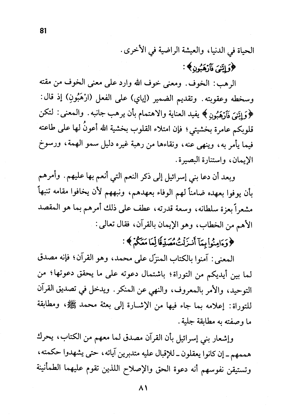 الرهب: الخوف. ومعنى خوف الله وارد على معنى الخوف من مقته وسخطه وعقوبته. وتقديم الضمير (إياي) على الفعل (ارْهَبُونِ) إذ قال: {وَإِيَّايَ فَارْهَبُونِ} يفيد العناية والاهتمام بأن يرهب جانبه. والمعنى: لتكن قلوبكم عامرة بخشيتي؛ فإن امتلاء القلوب بخشية الله أعونُ لها على طاعته فيما يأمر به، وينهى عنه، ونقاءها من رهبة غيره دليل سمو الهمة، ورسوخ الإيمان، واستنارة البصيرة.