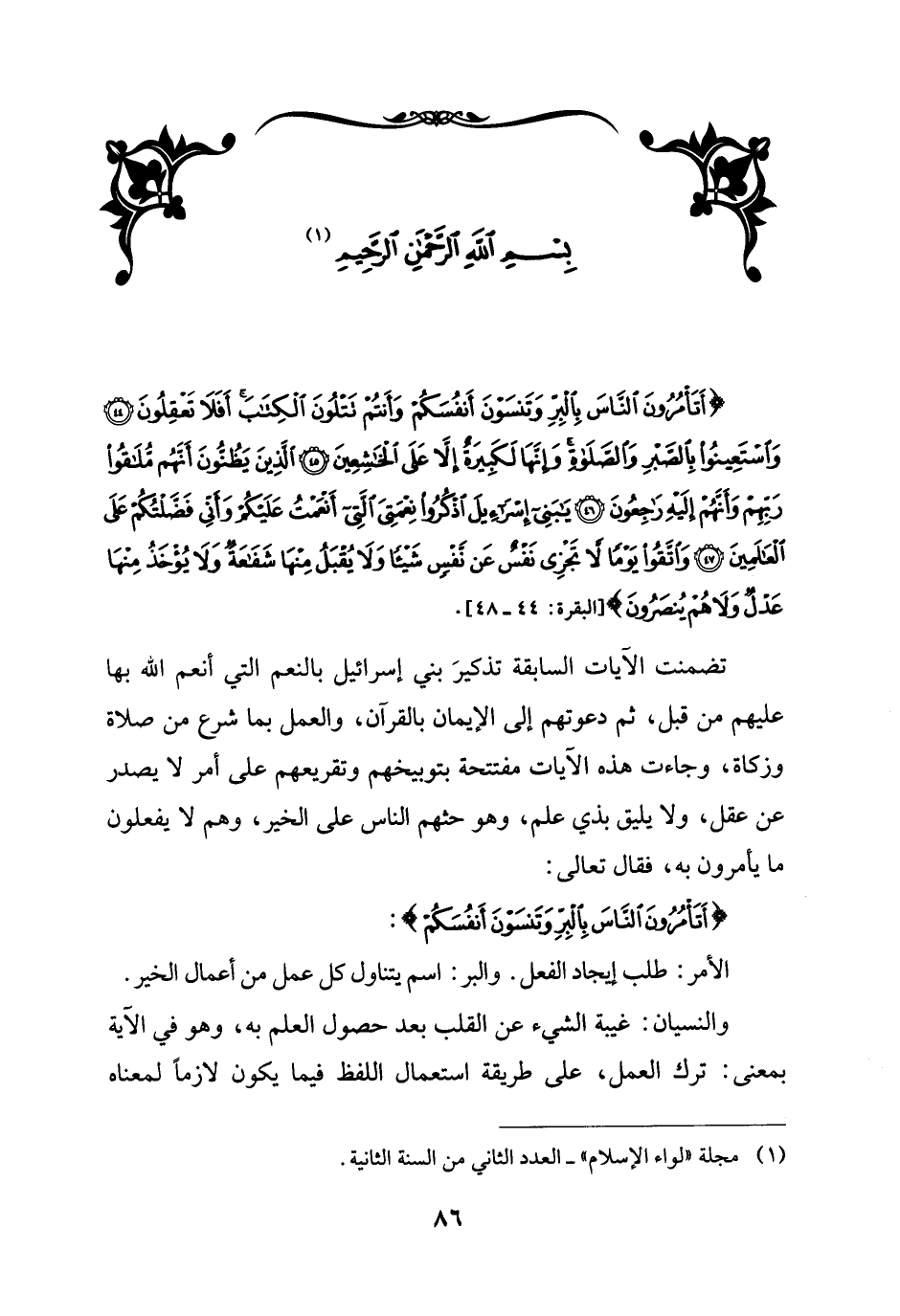 {أَتَأْمُرُونَ النَّاسَ بِالْبِرِّ وَتَنْسَوْنَ أَنْفُسَكُمْ وَأَنْتُمْ تَتْلُونَ الْكِتَابَ أَفَلَا تَعْقِلُونَ (44) وَاسْتَعِينُوا بِالصَّبْرِ وَالصَّلَاةِ وَإِنَّهَا لَكَبِيرَةٌ إِلَّا عَلَى الْخَاشِعِينَ (45) الَّذِينَ يَظُنُّونَ أَنَّهُمْ مُلَاقُو رَبِّهِمْ وَأَنَّهُمْ إِلَيْهِ رَاجِعُونَ (46) يَابَنِي إِسْرَائِيلَ اذْكُرُوا نِعْمَتِيَ الَّتِي أَنْعَمْتُ عَلَيْكُمْ وَأَنِّي فَضَّلْتُكُمْ عَلَى الْعَالَمِينَ (47) وَاتَّقُوا يَوْمًا لَا تَجْزِي نَفْسٌ عَنْ نَفْسٍ شَيْئًا وَلَا يُقْبَلُ مِنْهَا شَفَاعَةٌ وَلَا يُؤْخَذُ مِنْهَا عَدْلٌ وَلَا هُمْ يُنْصَرُونَ} [البقرة: 44 - 48].