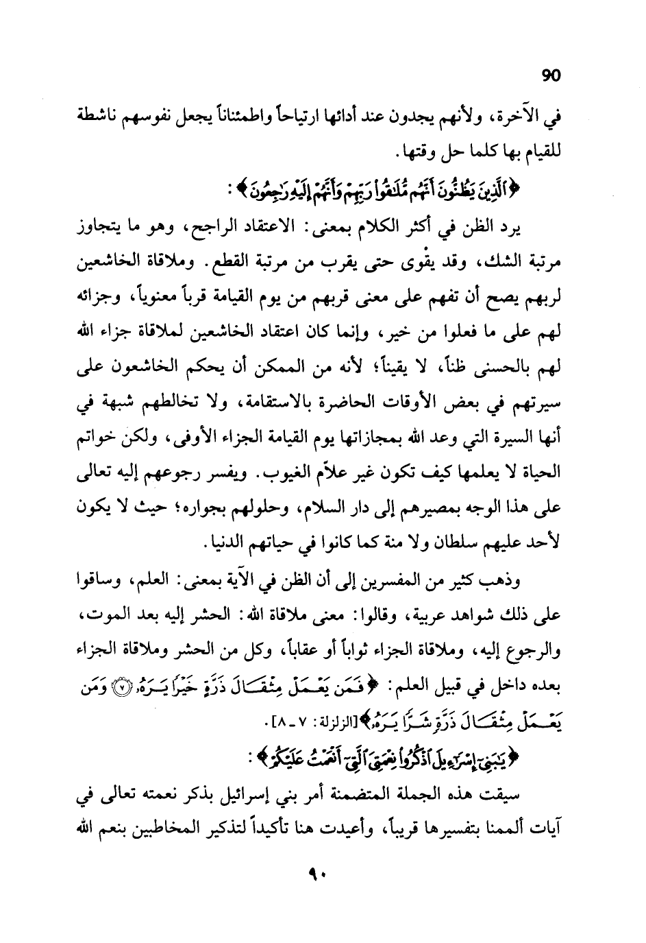 يرد الظن في أكثر الكلام بمعنى: الاعتقاد الراجح، وهو ما يتجاوز مرتبة الشك، وقد يقْوى حتى يقرب من مرتبة القطع. وملاقاة الخاشعين لربهم يصح أن تفهم على معنى قربهم من يوم القيامة قرباً معنوياً، وجزائه لهم على ما فعلوا من خير، وإنما كان اعتقاد الخاشعين لملاقاة جزاء الله لهم بالحسنى ظناً، لا يقيناً؛ لأنه من الممكن أن يحكم الخاشعون على سيرتهم في بعض الأوقات الحاضرة بالاستقامة، ولا تخالطهم شبهة في أنها السيرة التي وعد الله بمجازاتها يوم القيامة الجزاء الأوفى، ولكن خواتم الحياة لا يعلمها كيف تكون غير علاّم الغيوب. ويفسر رجوعهم إليه تعالى على هذا الوجه بمصيرهم إلى دار السلام، وحلولهم بجواره؛ حيث لا يكون لأحد عليهم سلطان ولا منة كما كانوا في حياتهم الدنيا.