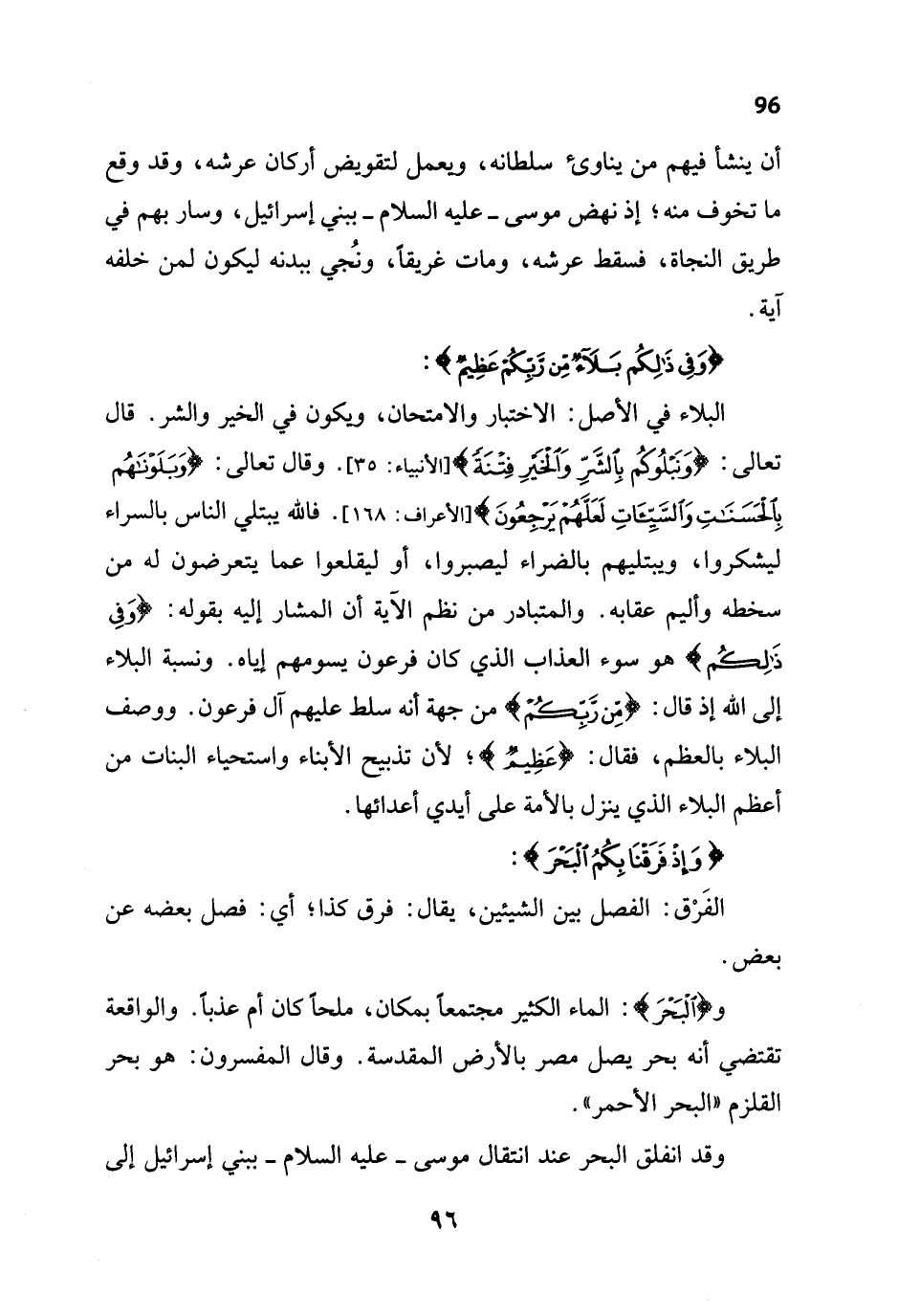 البلاء في الأصل: الاختبار والامتحان، ويكون في الخير والشر. قال تعالى: {وَنَبْلُوكُمْ بِالشَّرِّ وَالْخَيْرِ فِتْنَةً} [الأنبياء: 35]. وقال تعالى: {وَبَلَوْنَاهُمْ بِالْحَسَنَاتِ وَالسَّيِّئَاتِ لَعَلَّهُمْ يَرْجِعُونَ} [الأعراف: 168]. فالله يبتلي الناس بالسراء ليشكروا، ويبتليهم بالضراء ليصبروا، أو ليقلعوا عما يتعرضون له من سخطه وأليم عقابه. والمتبادر من نظم الآية أن المشار إليه بقوله: {وَفِي ذَلِكُمْ} هو سوء العذاب الذي كان فرعون يسومهم إياه. ونسبة البلاء إلى الله إذ قال: {مِنْ رَبِّكُمْ} من جهة أنه سلط عليهم آل فرعون. ووصف البلاء بالعظم، فقال: {عَظِيمٌ}؛ لأن تذبيح الأبناء واستحياء البنات من أعظم البلاء الذي ينزل بالأمة على أيدي أعدائها.