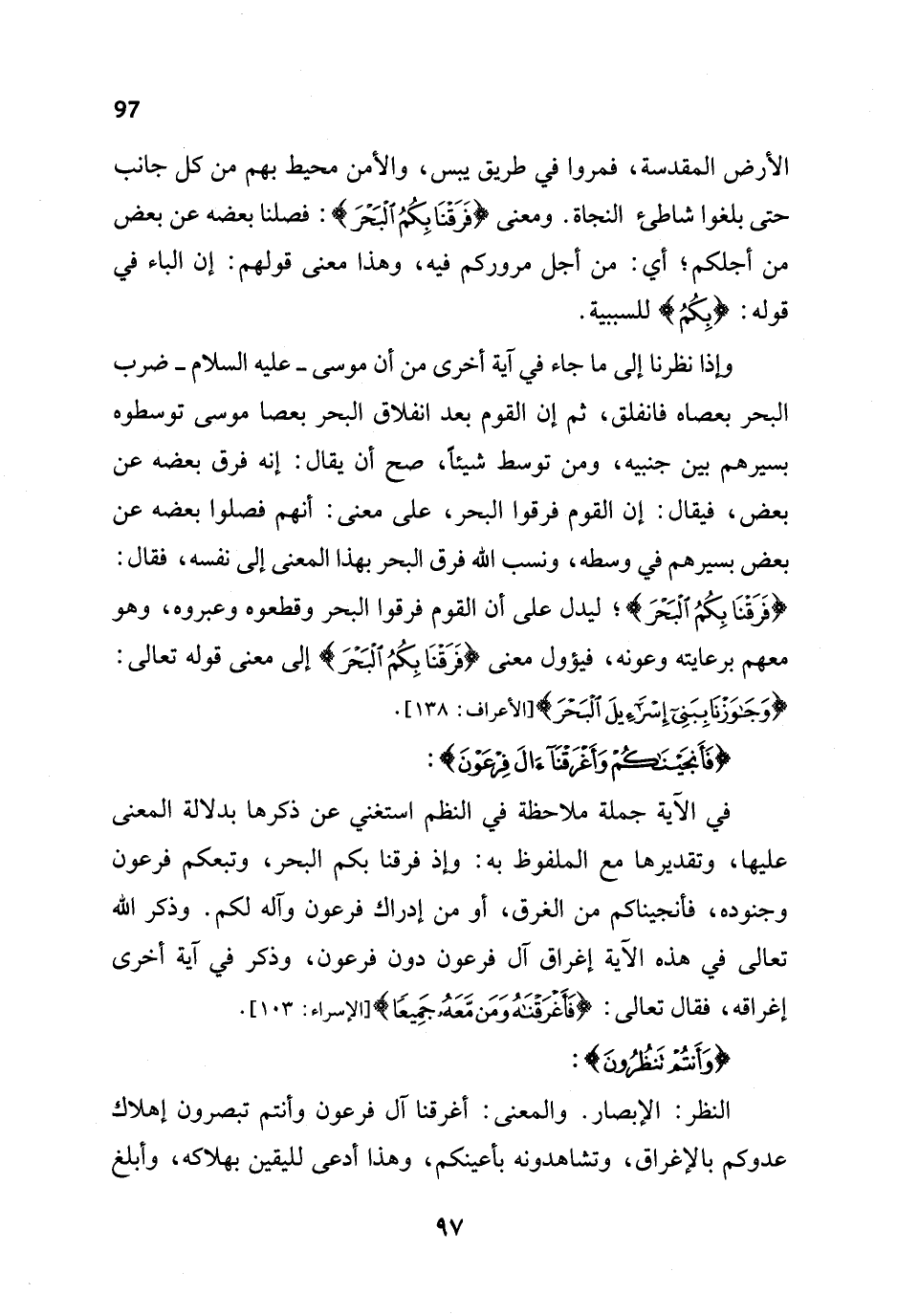 وإذا نظرنا إلى ما جاء في آية أخرى من أن موسى - عليه السلام - ضرب البحر بعصاه فانفلق، ثم إن القوم بعد انفلاق البحر بعصا موسى توسطوه بسيرهم بين جنبيه، ومن توسط شيئاً، صح أن يقال: إنه فرق بعضه عن بعض، فيقال: إن القوم فرقوا البحر، على معنى: أنهم فصلوا بعضه عن بعض بسيرهم في وسطه، ونسب الله فرق البحر بهذا المعنى إلى نفسه، فقال: {فَرَقْنَا بِكُمُ الْبَحْر}؛ ليدل على أن القوم فرقوا البحر وقطعوه وعبروه، وهو معهم برعايته وعونه، فيؤول معنى {فَرَقْنَا بِكُمُ الْبَحْرَ} إلى معنى قوله تعالى:
