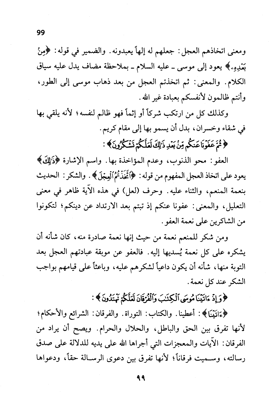 العفو: محو الذنوب، وعدم المؤاخذة بها. واسم الإشارة {ذَلِكَ} يعود على اتخاذ العجل المفهوم من قوله: {اتَّخَذْتُمُ الْعِجْلَ}. والشكر: الحديث بنعمة المنعم، والثناء عليه. وحرف (لعل) في هذه الآية ظاهر في معنى التعليل، والمعنى: عفونا عنكم إذ تبتم بعد الارتداد عن دينكم؛ لتكونوا من الشاكرين على نعمة العفو.