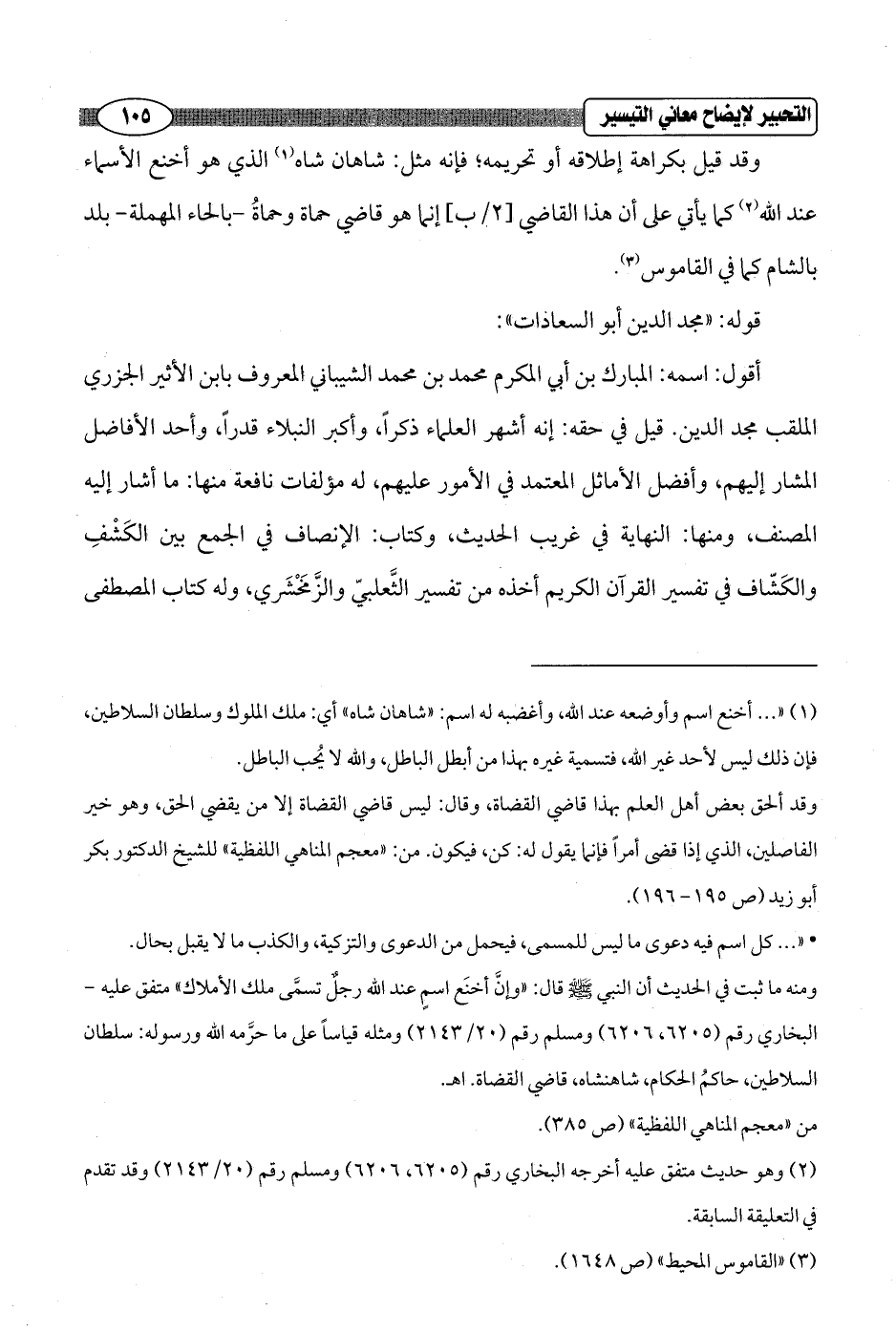 • " ... كل اسم فيه دعوى ما ليس للمسمى، فيحمل من الدعوى والتزكية، والكذب ما لا يقبل بحال. ومنه ما ثبت في الحديث أن النبي - صلى الله عليه وسلم - قال: "وإنَّ أخنَع اسمٍ عند الله رجلٌ تسمَّى ملك الأملاك" متفق عليه - البخاري رقم (6205، 6206) ومسلم رقم (20/ 2143) ومثله قياساً على ما حرَّمه الله ورسوله: سلطان السلاطين، حاكمُ الحكام، شاهنشاه, قاضي القضاة. اهـ.