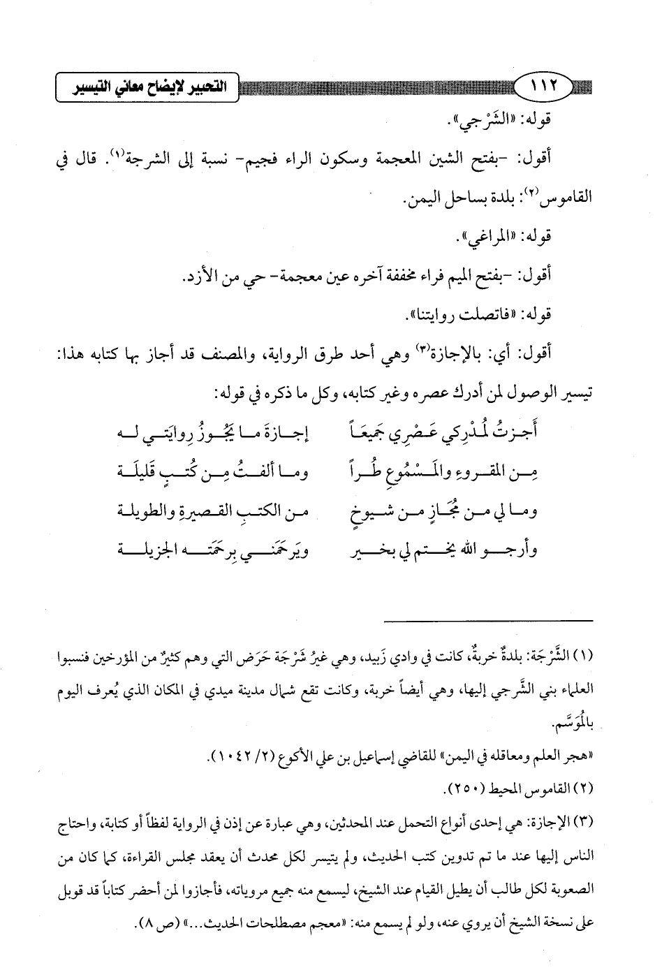 (¬3) الإجازة: هي إحدى أنواع التحمل عند المحدثين، وهي عبارة عن إذن في الرواية لفظاً أو كتابة، واحتاج الناس إليها عند ما تم تدوين كتب الحديث، ولم يتيسر لكل محدث أن يعقد مجلس القراءة، كما كان من الصعوبة لكل طالب أن يطيل القيام عند الشيخ، ليسمع منه جميع مروياته، فأجازوا لمن أحضر كتاباً قد قوبل على نسخة الشيخ أن يروي عنه ولو لم يسمع منه: "معجم مصطلحات الحديث ... " (ص 8).