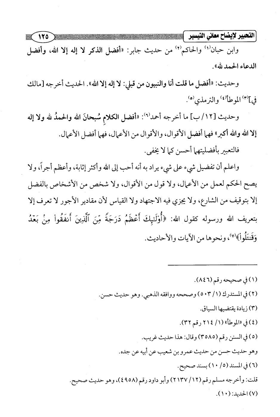 واعلم أن تفضيل شيء على شيء يراد به أنه أحب إلى الله وأكثر إثابة، وأعظم أجراً، ولا يصح الحكم لعمل من الأعمال، ولا قول من الأقوال، ولا شخص من الأشخاص بالفضل إلا بتوقيف من الشارع، ولا يجزي فيه الاجتهاد ولا القياس لأن مقادير الأجور لا تعرف إلا بتعريف الله ورسوله كقول الله: {أُولَئِكَ أَعْظَمُ دَرَجَةً مِنَ الَّذِينَ أَنْفَقُوا مِنْ بَعْدُ وَقَاتَلُوا} (¬7)، ونحوها من الآيات والأحاديث.