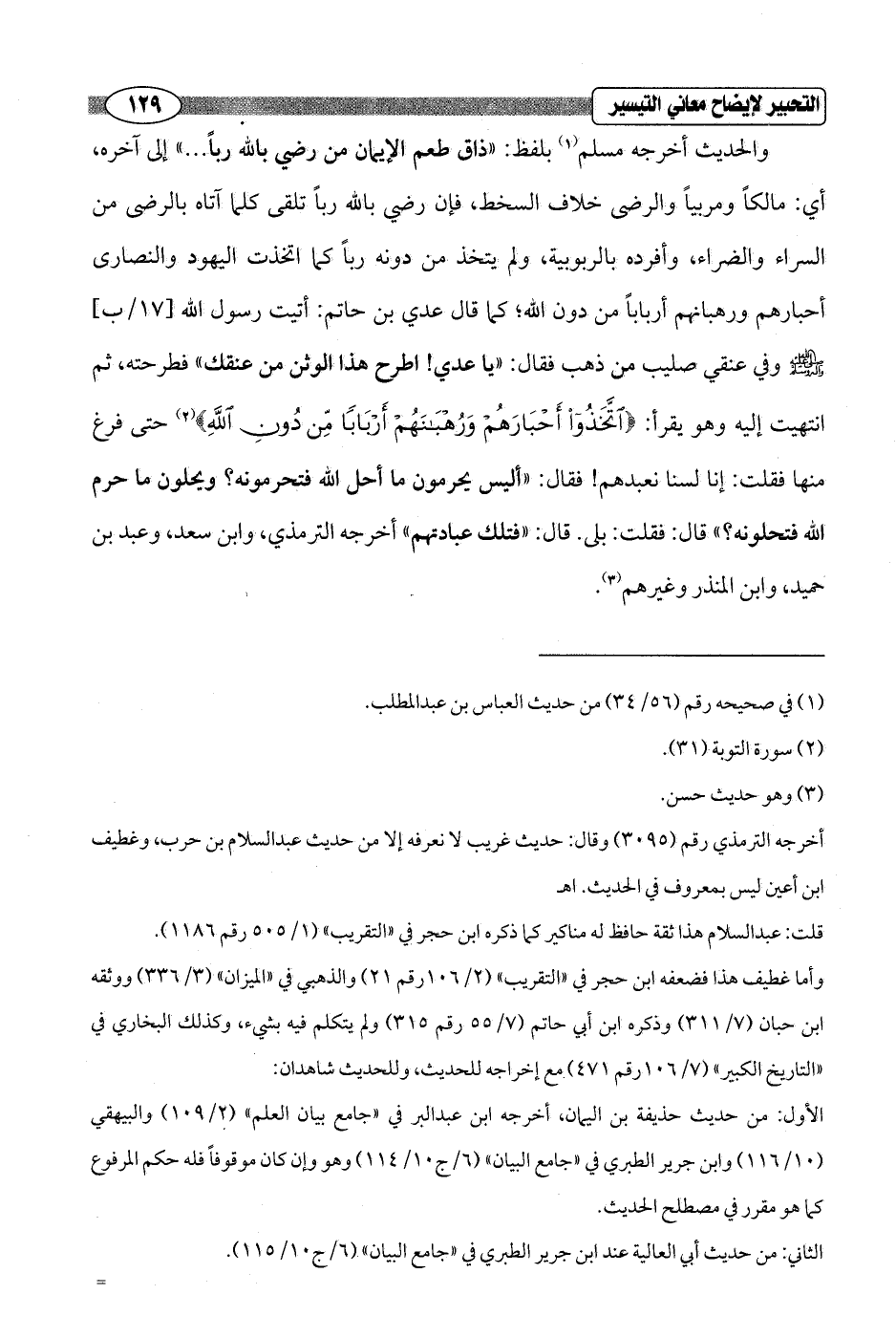 والحديث أخرجه مسلم (¬1) بلفظ: "ذاق طعم الإيمان من رضي بالله رباً ... " إلى آخره، أي: مالكاً ومربياً والرضى خلاف السخط، فإن رضي بالله رباً تلقى كلما آتاه بالرضى من السراء والضراء، وأفرده بالربوبية، ولم يتخذ من دونه رباً كما اتخذت اليهود والنصارى أحبارهم ورهبانهم أرباباً من دون الله؛ كما قال عدي بن حاتم: أتيت رسول الله [17/ ب]- صلى الله عليه وسلم - وفي عنقي صليب من ذهب فقال: "يا عدي! اطرح هذا الوثن من عنقك" فطرحته، ثم انتهيت إليه وهو يقرأ: {اتَّخَذُوا أَحْبَارَهُمْ وَرُهْبَانَهُمْ أَرْبَابًا مِنْ دُونِ اللَّهِ} (¬2) حتى فرغ منها فقلت: إنا لسنا نعبدهم! فقال: "أليس يحرمون ما أحل الله فتحرمونه؟ ويحلون ما حرم الله فتحلونه؟ " قال: فقلت: بلى. قال: "فتلك عبادتهم" أخرجه الترمذي، وابن سعد، وعبد بن حميد، وابن المنذر وغيرهم (¬3).