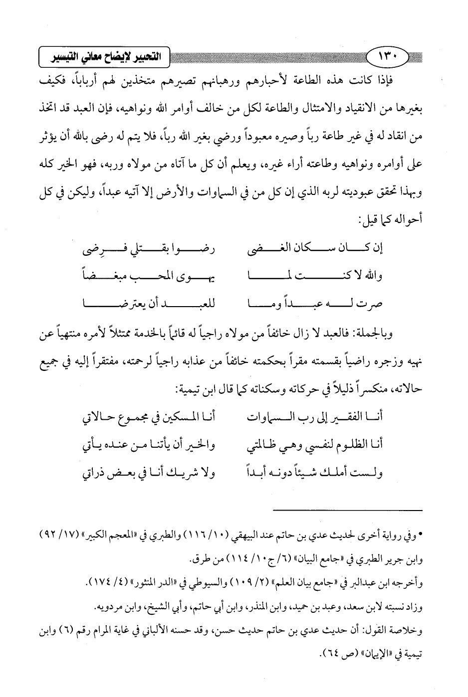 فإذا كانت هذه الطاعة لأحبارهم ورهبانهم تصيرهم متخذين لهم أرباباً، فكيف بغيرها من الانقياد والامتثال والطاعة لكل من خالف أوامر الله ونواهيه، فإن العبد قد اتخذ من انقاد له في غير طاعة رباً وصيره معبوداً ورضي بغير الله رباً، فلا يتم له رضى بالله أن يؤثر على أوامره ونواهيه وطاعته أراء غيره، ويعلم أن كل ما آتاه من مولاه وربه، فهو الخير كله وبهذا تحقق عبوديته لربه الذي إن كل من في السماوات والأرض إلا آتيه عبداً، وليكن في كل أحواله كما قيل: