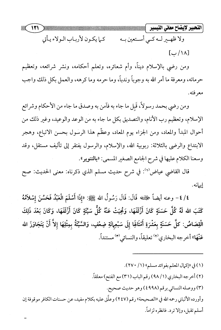 4/ 4 - وعنه أيضاً - رضي الله عنه - قَالَ: قَالَ رَسُولُ الله - صلى الله عليه وسلم -: "إِذَا أَسْلَمَ الْعَبْدُ فَحَسُنَ إِسْلاَمُهُ كَتَبَ الله لَهُ كُلَّ حَسَنَةٍ كَانَ أَزْلَفَهَا، وَمُحِيَتْ عَنْهُ كُلُّ سَيِّئَةٍ كَانَ أَزْلَفَهَا، وَكَانَ بَعْدَ ذَلِكَ الْقِصَاصُ: كلَّ حَسَنةٍ بِعَشْرَةِ أَمْثَالهِا إِلَى سَبْعِمِائَةِ ضِعْفٍ، وَالسَّيِّئَةُ بِمِثْلِهَا إِلاَّ أَنْ يَتَجَاوَزَ الله عَنْهَا" أخرجه البخاري (¬2) تعليقاً، والنسائي (¬3) مستنداً.