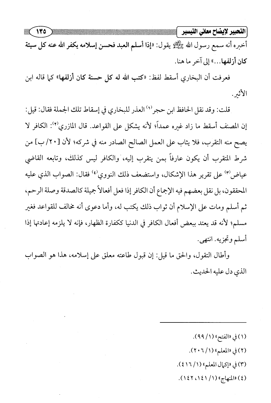 قلت: وقد نقل الحافظ ابن حجر (¬1) العذر للبخاري في إسقاط تلك الجملة فقال: قيل: إن المصنف أسقط ما زاد غيره عمداً؛ لأنه يشكل على القواعد. قال المازري (¬2): الكافر لا يصح منه التقرب، فلا يثاب على العمل الصالح الصادر منه في شركه؛ لأن [20/ ب] من شرط المتقرب أن يكون عارفاً بمن يتقرب إليه، والكافر ليس كذلك، وتابعه القاضي عياض (¬3) على تقرير هذا الإشكال، واستضعف ذلك النووي (¬4) فقال: الصواب الذي عليه المحققون، بل نقل بعضهم فيه الإجماع أن الكافر إذا فعل أفعالاً جميلة كالصدقة وصلة الرحم، ثم أسلم ومات على الإسلام أن ثواب ذلك يكتب له، وأما دعوى أنه مخالف للقواعد فغير مسلم؛ لأنه قد يعتد ببعض أفعال الكافر في الدنيا ككفارة الظهار، فإنه لا يلزمه إعادتها إذا أسلم وتجزيه. انتهى.