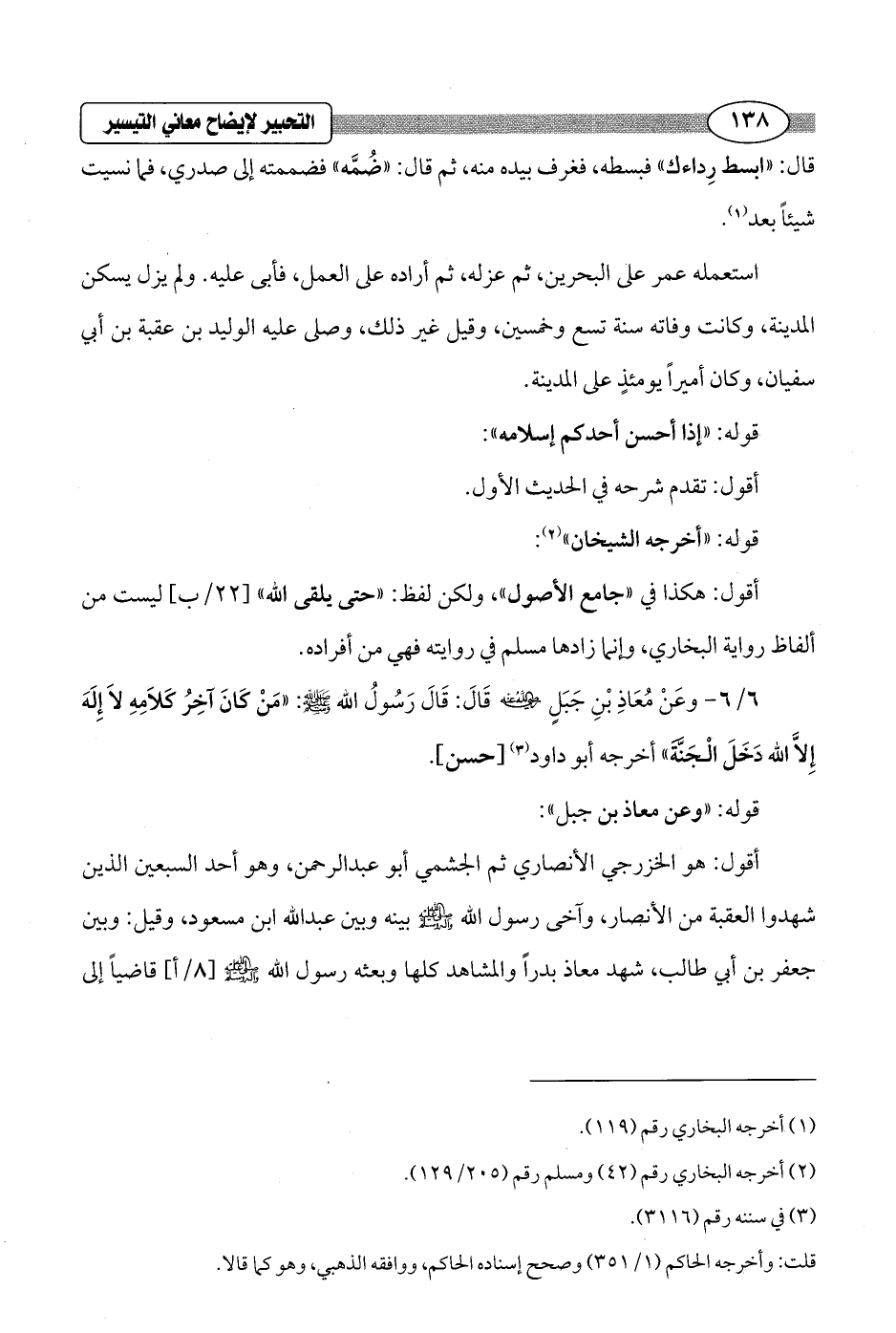 أقول: هو الخزرجي الأنصاري ثم الجشمي أبو عبد الرحمن، وهو أحد السبعين الذين شهدوا العقبة من الأنصار، وآخى رسول الله - صلى الله عليه وسلم - بينه وبين عبد الله ابن مسعود، وقيل: وبين جعفر بن أبي طالب، شهد معاذ بدراً والمشاهد كلها وبعثه رسول الله - صلى الله عليه وسلم -[8/ أ] قاضياً إلى