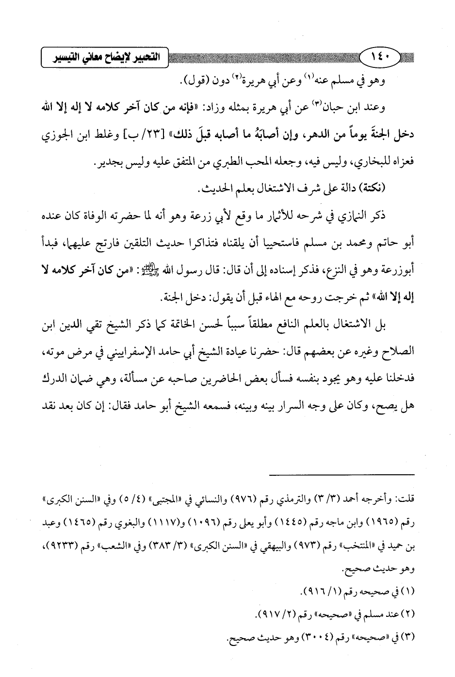 بل الاشتغال بالعلم النافع مطلقاً سبباً لحسن الخاتمة كما ذكر الشيخ تقي الدين ابن الصلاح وغيره عن بعضهم قال: حضرنا عيادة الشيخ أبي حامد الإسفراييني في مرض موته، فدخلنا عليه وهو يجود بنفسه فسأل بعض الحاضرين صاحبه عن مسألة، وهي ضمان الدرك هل يصح، وكان على وجه السرار بينه وبينه، فسمعه الشيخ أبو حامد فقال: إن كان بعد نقد