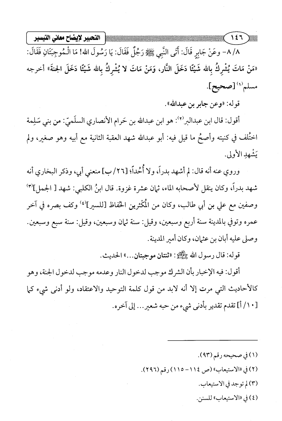 8/ 8 - وعَنْ جَابِرٍ قَالَ: أَتَى النَّبِي - صلى الله عليه وسلم - رَجُلٌ فَقَالَ: يَا رَسُولَ الله! مَا الْمُوجِبَتَانِ فَقَالَ: "مَنْ مَاتَ يُشْرِكُ بِالله شَيْئًا دَخَلَ النَّار، وَمَنْ مَاتَ لا يُشْرِكُ بِالله شَيْئًا دَخَلَ الجنة" أخرجه مسلم (¬1) [صحيح].