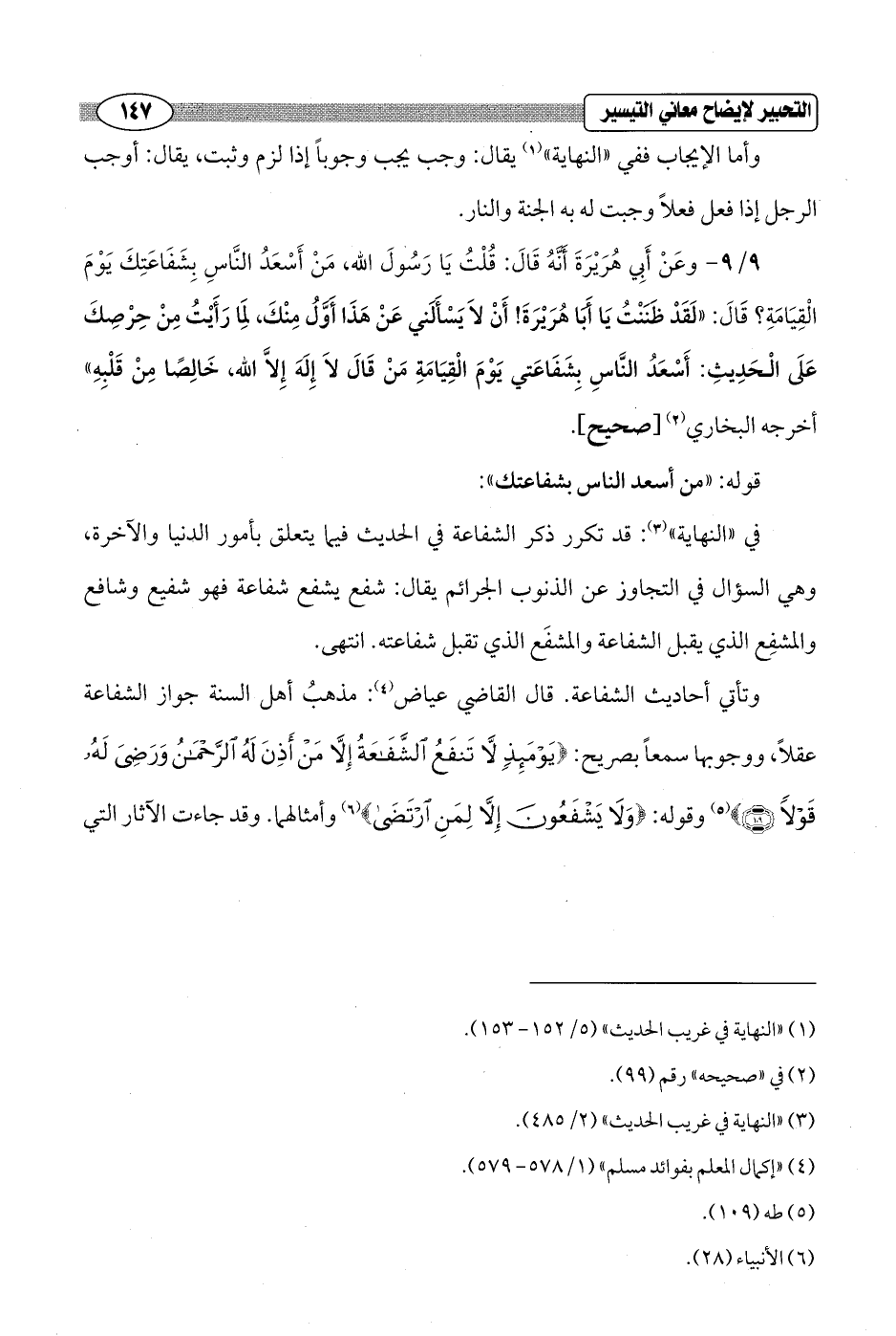 وتأتي أحاديث الشفاعة. قال القاضي عياض (¬4): مذهبُ أهل السنة جواز الشفاعة عقلاً، ووجوبها سمعاً بصريح: {يَوْمَئِذٍ لَا تَنْفَعُ الشَّفَاعَةُ إِلَّا مَنْ أَذِنَ لَهُ الرَّحْمَنُ وَرَضِيَ لَهُ قَوْلًا (109)} (¬5) وقوله: {وَلَا يَشْفَعُونَ إِلَّا لِمَنِ ارْتَضَى} (¬6) وأمثالهما. وقد جاءت الآثار التي