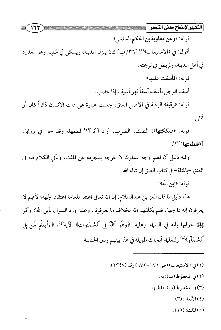 هذا دليل لما قال العز بن عبد السلام: إن الله تعالى اغتفر للعامة اعتقاد الجهة؛ لأنهم لا يعرفون إله ذا جهة، فلم يكلفهم الله بخلاف ما يعرفونه، وعليه ورد السؤال بأين الله؟ وأقر - صلى الله عليه وسلم - جوابها بأنه في السماء وعليه: {وَهُوَ اللَّهُ فِي السَّمَاوَاتِ} الآية (¬4)، {أَأَمِنْتُمْ مَنْ فِي السَّمَاءِ} (¬5) وللعلماء أبحاث طويلة في هذا بينهم وبين الحنابلة.