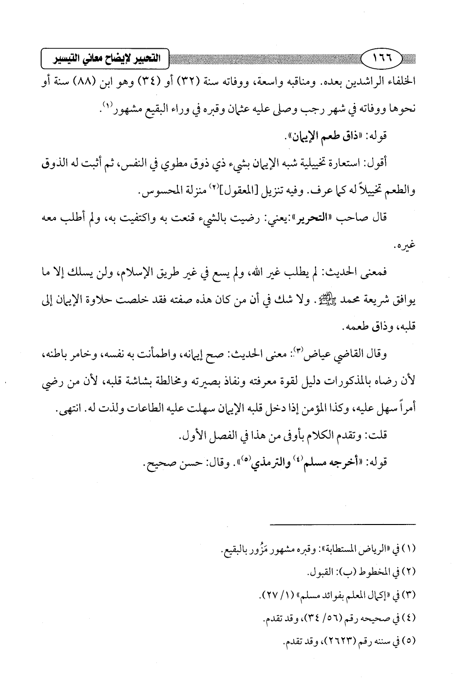 فمعنى الحديث: لم يطلب غير الله، ولم يسع في غير طريق الإسلام، ولن يسلك إلا ما يوافق شريعة محمد - صلى الله عليه وسلم -. ولا شك في أن من كان هذه صفته فقد خلصت حلاوة الإيمان إلى قلبه، وذاق طعمه.