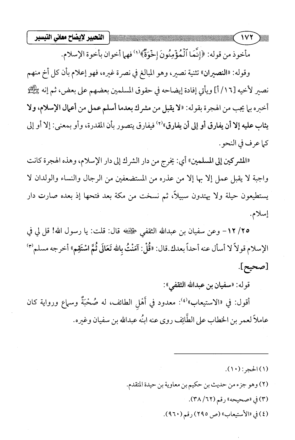 25/ 12 - وعن سفيان بن عبد الله الثقفي - رضي الله عنه - قال: قلت: يا رسول الله! قل لي في الإسلام قولاً لا أسأل عنه أحداً بعدك. قال: "قُلْ: آمَنْتُ بِالله تَعَالَى ثُمَّ اسْتَقِم" أخرجه مسلم (¬3) [صحيح].