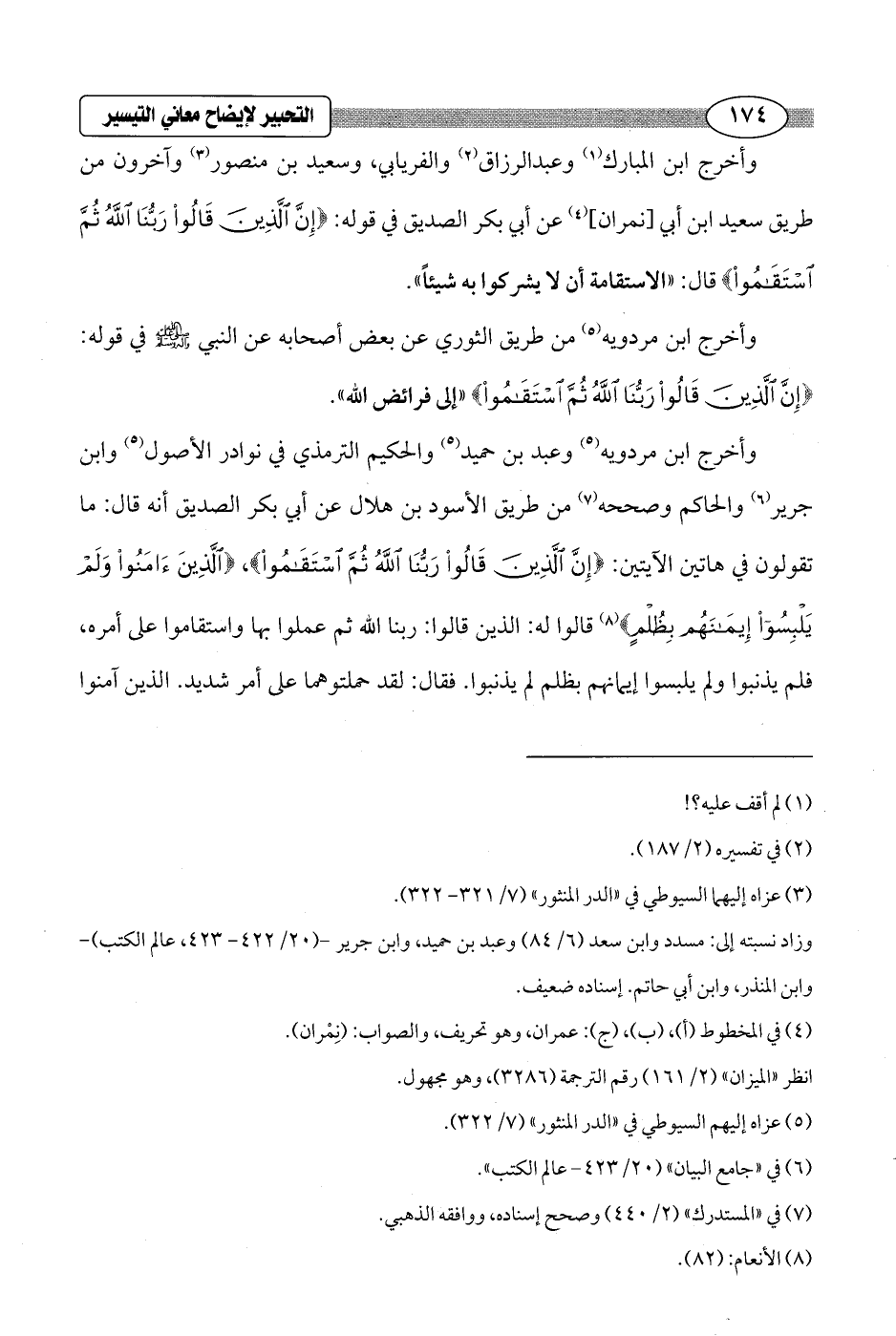 وأخرج ابن المبارك (¬1) وعبد الرزاق (¬2) والفريابي، وسعيد بن منصور (¬3) وآخرون من طريق سعيد ابن أبي [نمران] (¬4) عن أبي بكر الصديق في قوله: {إِنَّ الَّذِينَ قَالُوا رَبُّنَا اللَّهُ ثُمَّ اسْتَقَامُوا} قال: "الاستقامة أن لا يشركوا به شيئاً".