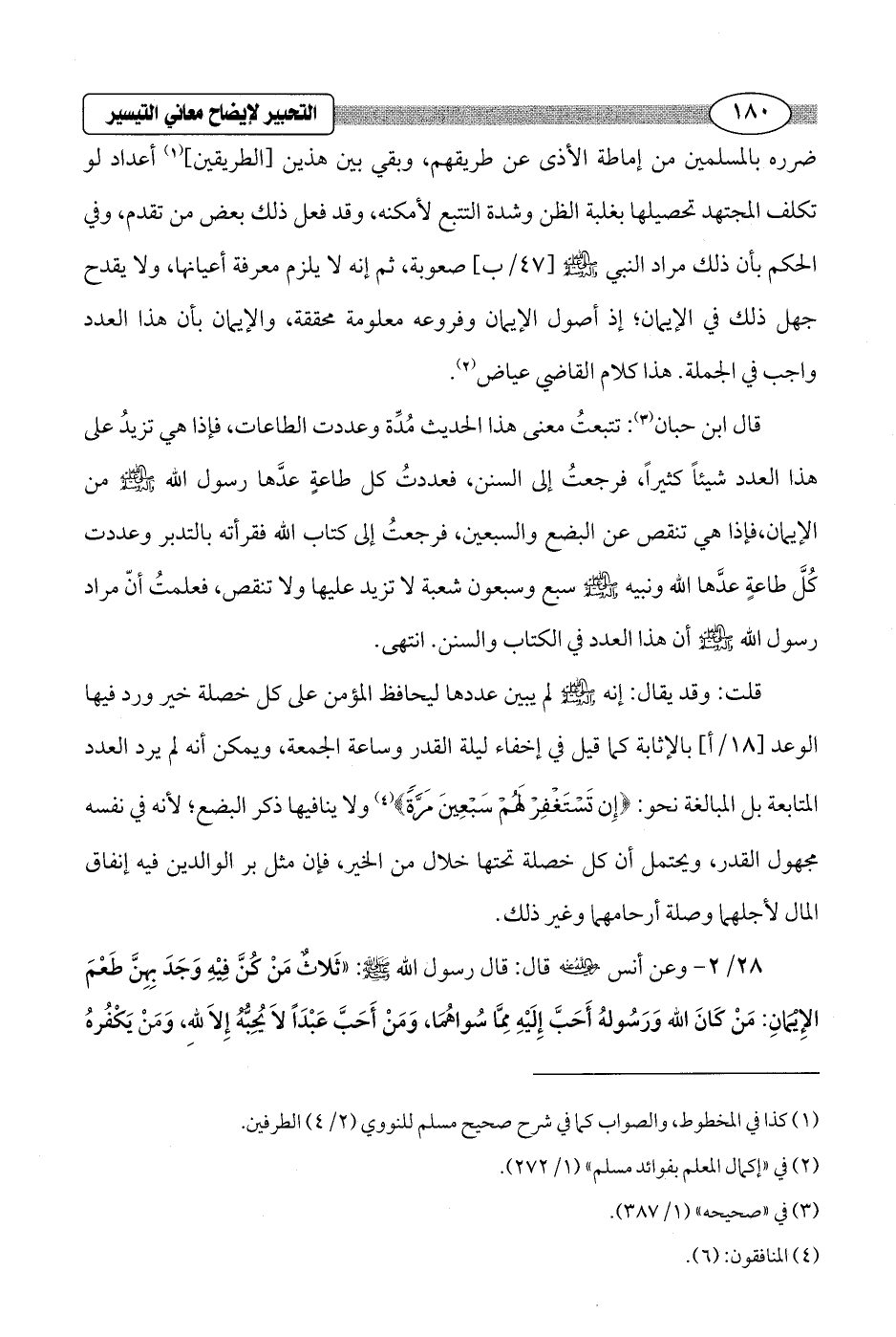 قال ابن حبان (¬3): تتبعتُ معنى هذا الحديث مُدِّة وعددت الطاعات، فإذا هي تزيدُ على هذا العدد شيئاً كثيراً، فرجعتُ إلى السنن، فعددتُ كل طاعةٍ عدَّها رسول الله - صلى الله عليه وسلم - من الإيمان، فإذا هي تنقص عن البضع والسبعين، فرجعتُ إلى كتاب الله فقرأته بالتدبر وعددت كُلَّ طاعةٍ عدَّها الله ونبيه - صلى الله عليه وسلم - سبع وسبعون شعبة لا تزيد عليها ولا تنقص، فعلمتُ أنّ مراد رسول الله - صلى الله عليه وسلم - أن هذا العدد في الكتاب والسنن. انتهى.