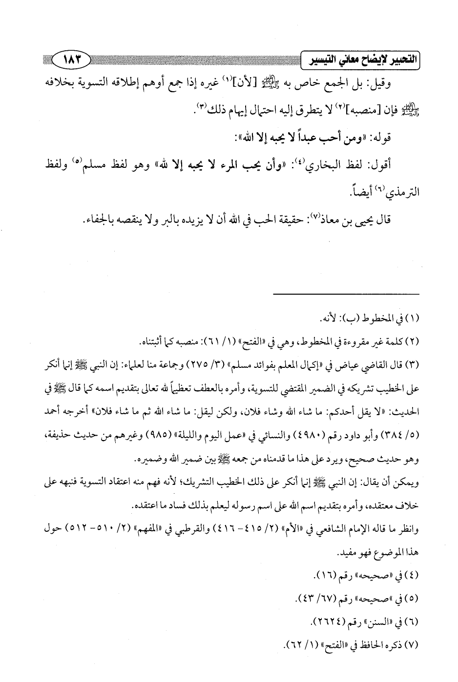 (¬3) قال القاضي عياض في "إكمال العلم بفوائد مسلم" (3/ 275) وجماعة منا لعلماء: إن النبي - صلى الله عليه وسلم - إنما أنكر على الخطيب تشريكه في الضمير المقتضي للتسوية، وأمره بالعطف تعظيماً لله تعالى بتقديم اسمه كما قال - صلى الله عليه وسلم - في الحديث: "لا يقل أحدكم: ما شاء الله وشاء فلان، ولكن ليقل: ما شاء الله ثم ما شاء فلان" أخرجه أحمد (5/ 384) وأبو داود رقم (4980) والنسائي في "عمل اليوم والليلة" (985) وغيرهم من حديث حذيفة، وهو حديث صحيح، ويرد على هذا ما قدمناه من جمعه - صلى الله عليه وسلم - بين ضمير الله وضميره.