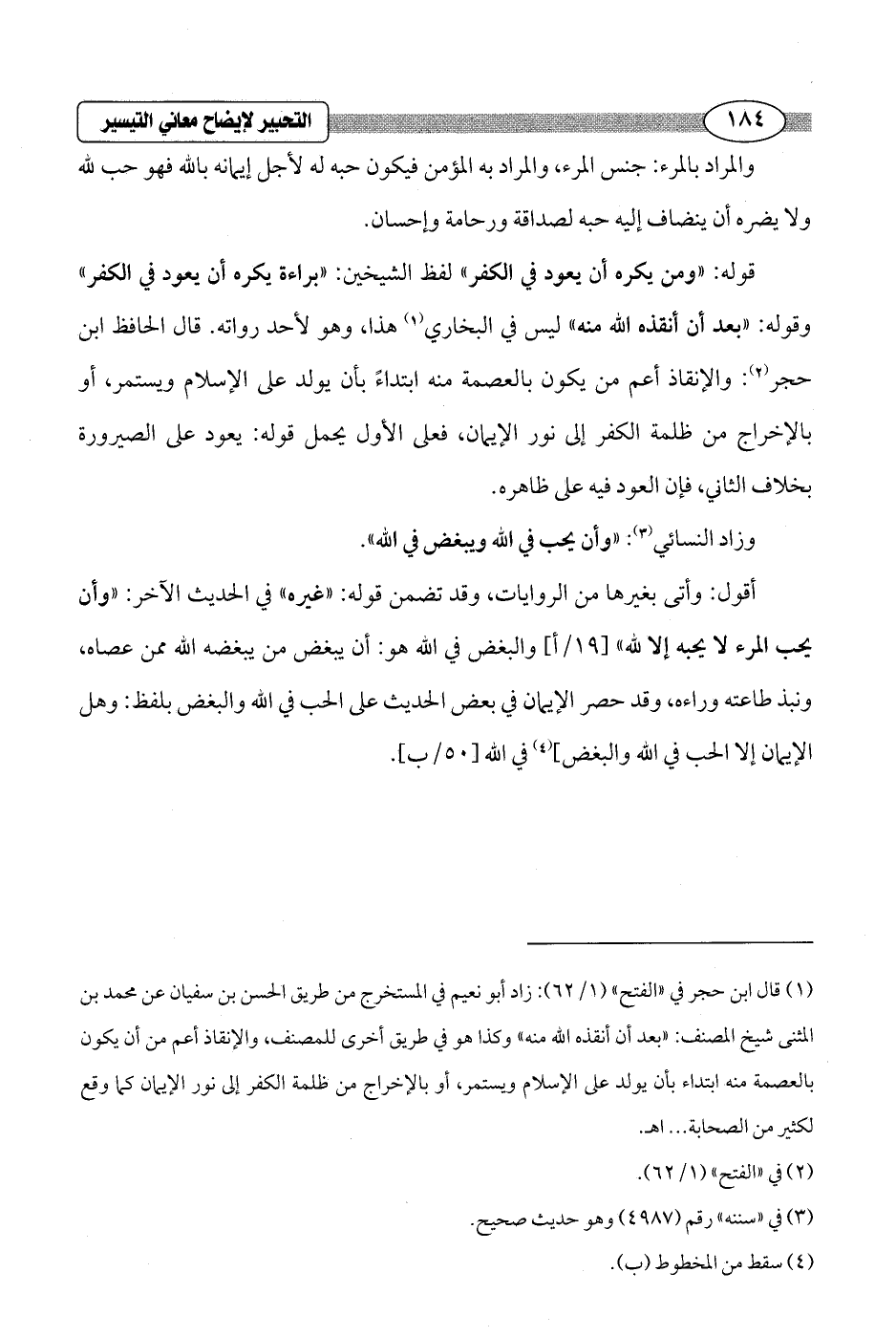 أقول: وأتى بغيرها من الروايات، وقد تضمن قوله: "غيره" في الحديث الآخر: "وأن يحب المرء لا يحبه إلا لله" [19/ أ] والبغض في الله هو: أن يبغض من يبغضه الله ممن عصاه، ونبذ طاعته وراءه، وقد حصر الإيمان في بعض الحديث على الحب في الله والبغض بلفظ: وهل الإيمان إلا الحب في الله والبغض] (¬4) في الله [50/ ب].
