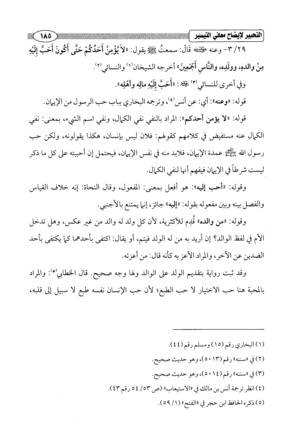 29/ 3 - وعنه - رضي الله عنه - قَالَ: سمعتُ - صلى الله عليه وسلم - يقول: "لاَ يُؤْمِنُ أَحَدُكُمْ حَتَّى أَكُونَ أَحَبَّ إِلَيْهِ مِنْ والدهِ, وولَدِه، والنَّاسِ أَجْمَعِينَ" أخرجه الشيخان (¬1) والنسائي (¬2).