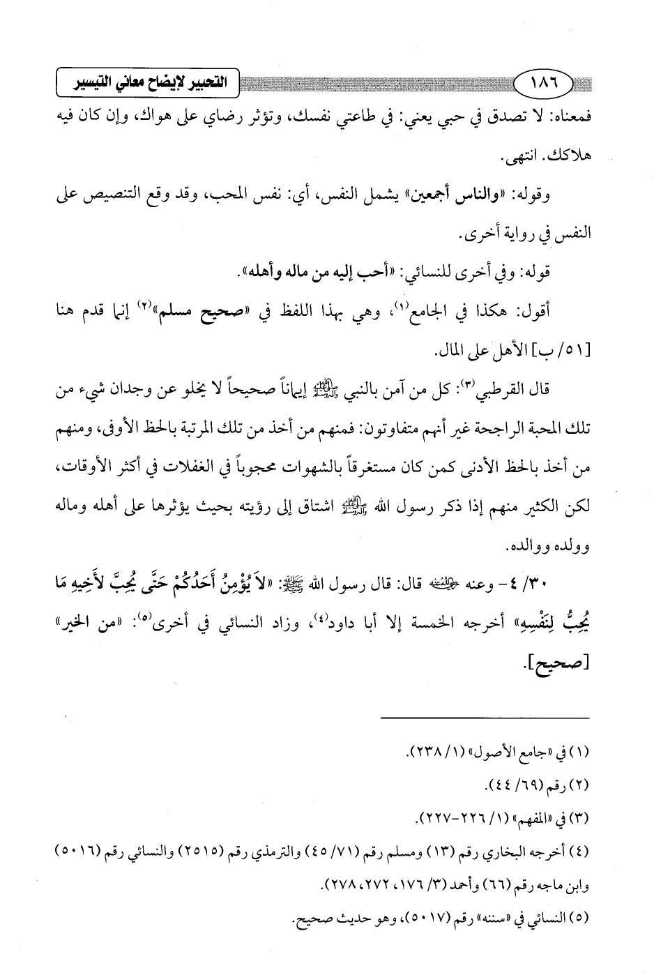 30/ 4 - وعنه - رضي الله عنه - قال: قال رسول الله - صلى الله عليه وسلم -: "لاَ يُؤْمِنُ أَحَدُكُمْ حَتَّى يُحِبَّ لأَخِيهِ مَا يُحِبُّ لِنَفْسِهِ" أخرجه الخمسة إلا أبا داود (¬4)، وزاد النسائي في أخرى (¬5): "من الخير" [صحيح].