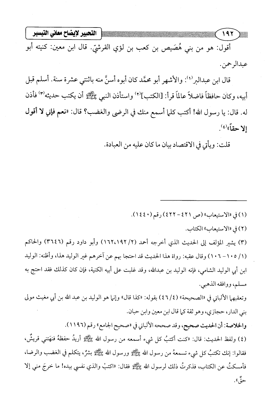 (¬4) ولفظ الحديث: قال: "كنت أكتبُ كل شيء أسمعه من رسول الله - صلى الله عليه وسلم - أريدُ حفظهُ فنهَتني قريشٌ، فقالوا: إنك تكتبُ كل شيء تسمعهُ من رسول الله - صلى الله عليه وسلم - ورسول الله - صلى الله عليه وسلم - بشرٌ، يتكلم في الغضب والرضا، فأمسكتُ عن الكتاب، فذكرتُ ذلك لرسول الله - صلى الله عليه وسلم - فقال: "اكتبْ والذي نفسي بيده! ما خرجَ مني إلا حقٌ".