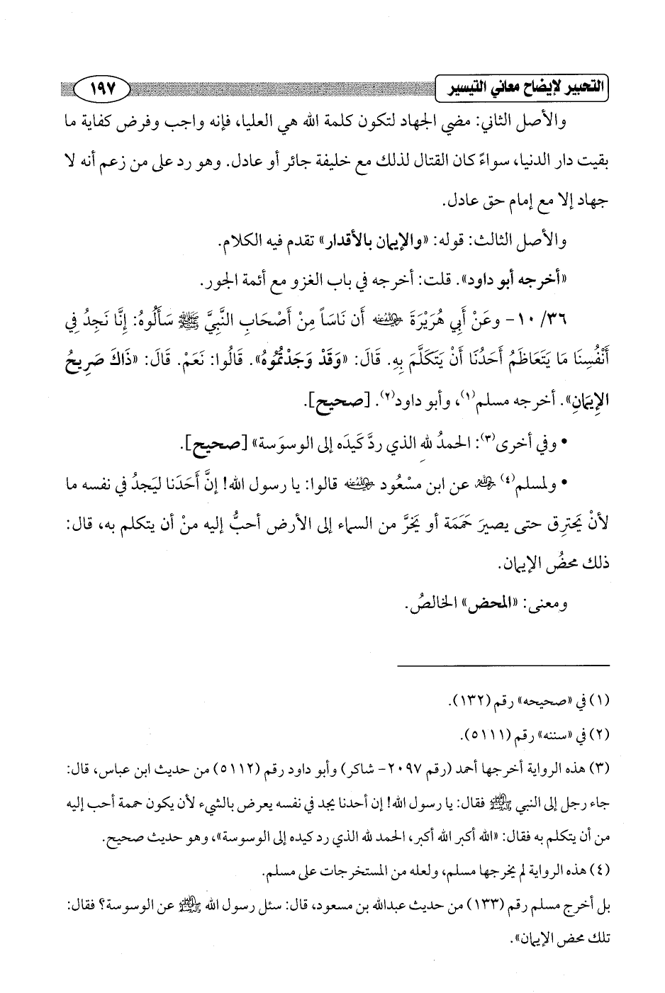 36/ 10 - وعَنْ أَبِي هُرَيْرَةَ - رضي الله عنه - أَن نَاسَاً مِنْ أَصْحَابِ النَّبِيَّ - صلى الله عليه وسلم - سَأَلُوهُ: إِنَّا نَجِدُ فِي أَنْفُسِنَا مَا يَتَعَاظَمُ أَحَدُنَا أَنْ يَتَكَلَّمَ بِهِ. قَالَ: "وَقَدْ وَجَدْتُمُوهُ". قَالُوا: نَعَمْ. قَالَ: "ذَاكَ صَرِيحُ الإِيمَانِ". أخرجه مسلم (¬1)، وأبو داود (¬2). [صحيح].