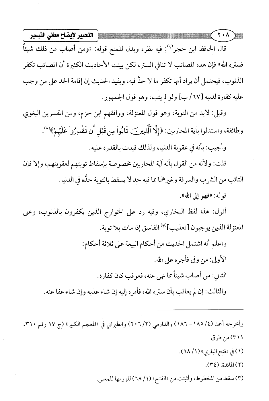 قال الحافظ ابن حجر (¬1): فيه نظر، ويدل للمنع قوله: "ومن أصاب من ذلك شيئاً فستره الله" فإن هذه المصائب لا تنافي الستر، لكن بينت الأحاديث الكثيرة أن المصائب تكفر الذنوب، فيحتمل أن يراد أنها تكفر ما لا حدَّ فيه، ويفيد الحديث إن إقامة الحد على من وجب عليه كفارة لذنبه [67/ ب] ولو لم يتب، وهو قول الجمهور.