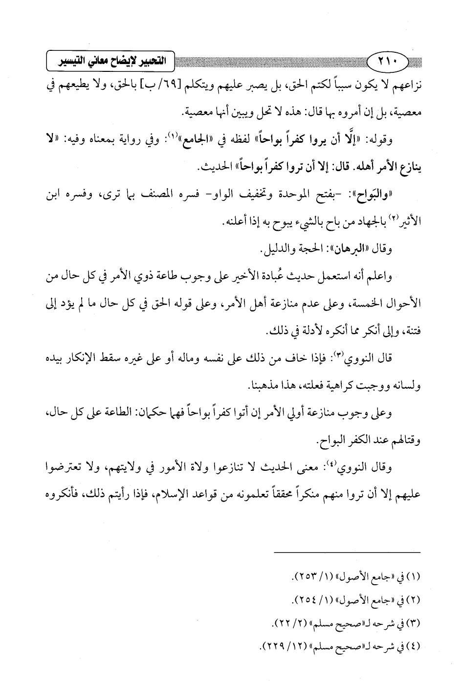 وعلى وجوب منازعة أولي الأمر إن أتوا كفراً بواحاً فهما حكمان: الطاعة على كل حال، وقتالهم عند الكفر البواح.