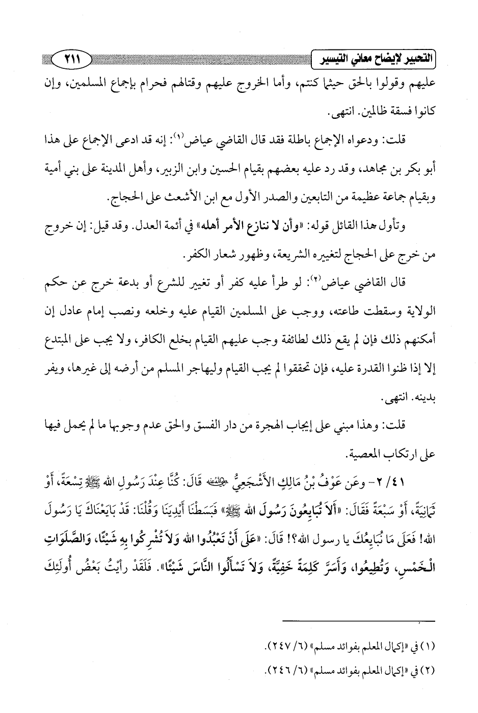 قلت: ودعواه الإجماع باطلة فقد قال القاضي عياض (¬1): إنه قد ادعى الإجماع على هذا أبو بكر بن مجاهد، وقد رد عليه بعضهم بقيام الحسن وابن الزبير، وأهل المدينة على بني أمية وبقيام جماعة عظيمة من التابعين والصدر الأول مع ابن الأشعث على الحجاج.