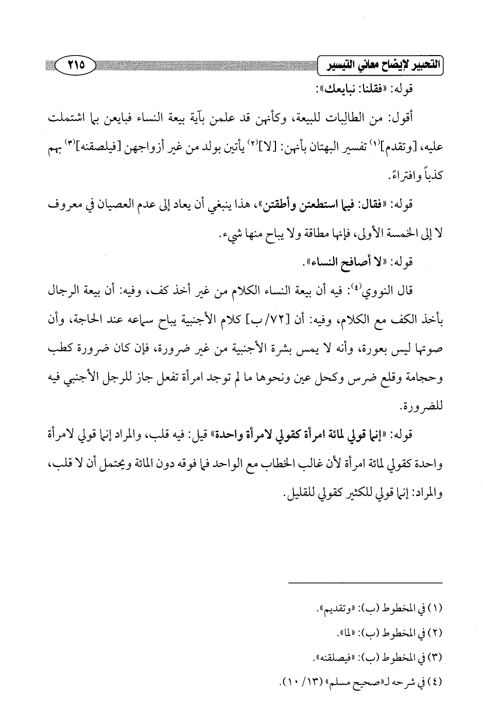 قوله: "إنما قولي لمائة امرأة كقولي لامرأة واحدة" قيل: فيه قلب، والمراد إنما قولي لامرأة واحدة كقولي لمائة امرأة لأن غالب الخطاب مع الواحد فما فوقه دون المائة ويحتمل أن لا قلب، والمراد: إنما قولي للكثير كقولي للقليل.