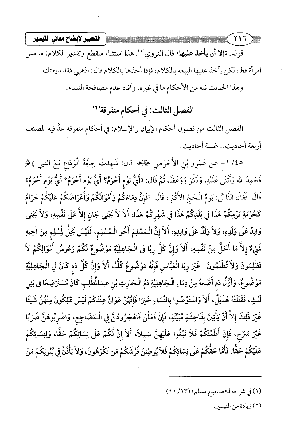 45/ 1 - عَن عَمْرِو بْنِ الأَحْوَصِ - رضي الله عنه - قال: شَهِدتُ حِجَّةَ الْوَدَاعِ مَعَ النبي - صلى الله عليه وسلم - فَحَمِدَ الله وَأثْنَى عَلَيْهِ، وَذَكَّرَ وَوَعَظَ، ثُمَّ قَالَ: "أَيُّ يَوْمٍ أَحْرَمُ؟ أَيُّ يَوْمٍ أَحْرَمُ؟ أَيُّ يَوْمٍ أَحْرَمُ" قَالَ: فَقَالَ النَّاسُ: يَوْمُ الْحَجِّ الأَكْبَرِ، قَالَ: "فَإِنَّ دِمَاءَكُمْ وَأَمْوَالَكُمْ وَأَعْرَاضَكُمْ عَلَيْكُمْ حَرَامٌ كَحُرْمَةِ يَوْمِكُمْ هَذَا في بَلَدِكُمْ هَذَا في شَهْرِكُمْ هَذَا، أَلاَ لاَ يَجْنِي جَانٍ إِلاَّ عَلَى نَفْسِهِ، وَلاَ يَجْنِي وَالِدٌ عَلَى وَلَدهِ، وَلاَ وَلَدٌ عَلَى وَالِدهِ، أَلاَ إِنَّ الْمُسْلِمَ أَخُو الْمُسْلِمِ، فَلَيْسَ يَحِلُّ لمُسْلِمٍ مِنْ أَخِيهِ شَيْءٌ إِلاَّ مَا أَحَلَّ مِنْ نَفْسِهِ، أَلاَ وَإِنَّ كُلَّ رِبًا في الْجَاهِلِيَّةِ مَوْضُوعٌ لَكُمْ رُءُوسُ أَمْوَالِكُمْ لاَ تَظْلِمُونَ وَلاَ تُظْلَمُونَ - غَيْرَ رِبَا الْعَبَّاسِ فَإِنَّهُ مَوْضُوعٌ كُلُّهُ، أَلاَ وَإِنَّ كُلَّ دَمٍ كَانَ في الْجَاهِلِيَّةِ مَوْضُوعٌ، وَأَوَّلُ دَمٍ أَضَعهُ مِنْ دِمَاءِ الْجَاهِلِيَّةِ دَمُ الْحَارِثِ بْنِ عبد المُطَّلِبِ كَانَ مُسْتَرْضِعًا في بَنِي لَيْثٍ، فَقَتَلَتْهُ هُذَيْلٌ، أَلاَ وَاسْتَوْصُوا بِالنِّسَاءِ خَيْرًا فَإِنَّهُنَّ عَوَانٌ عِنْدَكُمْ لَيْسَ تَمْلِكُونَ مِنْهُنَّ شَيْئًا غَيْرَ ذَلِكَ إِلاَّ أَنْ يَأْتِينَ بِفَاحِشَةٍ مُبَيِّنَةٍ، فَإِنْ فَعَلْنَ فَاهْجُرُوهُنَّ فِي الْمَضَاجعِ، وَاضْرُبوهُنَّ ضَرْبًا غَيْرَ مُبَرِّحٍ، فَإِنْ أَطَعْنكُمْ فَلاَ تَبْغُوا عَلَيْهِنَّ سَبِيلاً، أَلاَ إِنَّ لَكُمْ عَلَى نِسَائِكُمْ حَقًّا، وَلِنِسَائِكُمْ عَلَيْكُمْ حَقًّا: فَأَمَّا حَقُّكُمْ عَلَى نِسَائِكُمْ فَلاَ يُوطِئْنَ فُرُشَكُمْ مَنْ تَكْرَهُونَ، وَلاَ يَأْذَنَّ فِي بُيُوتِكُمْ مَنْ