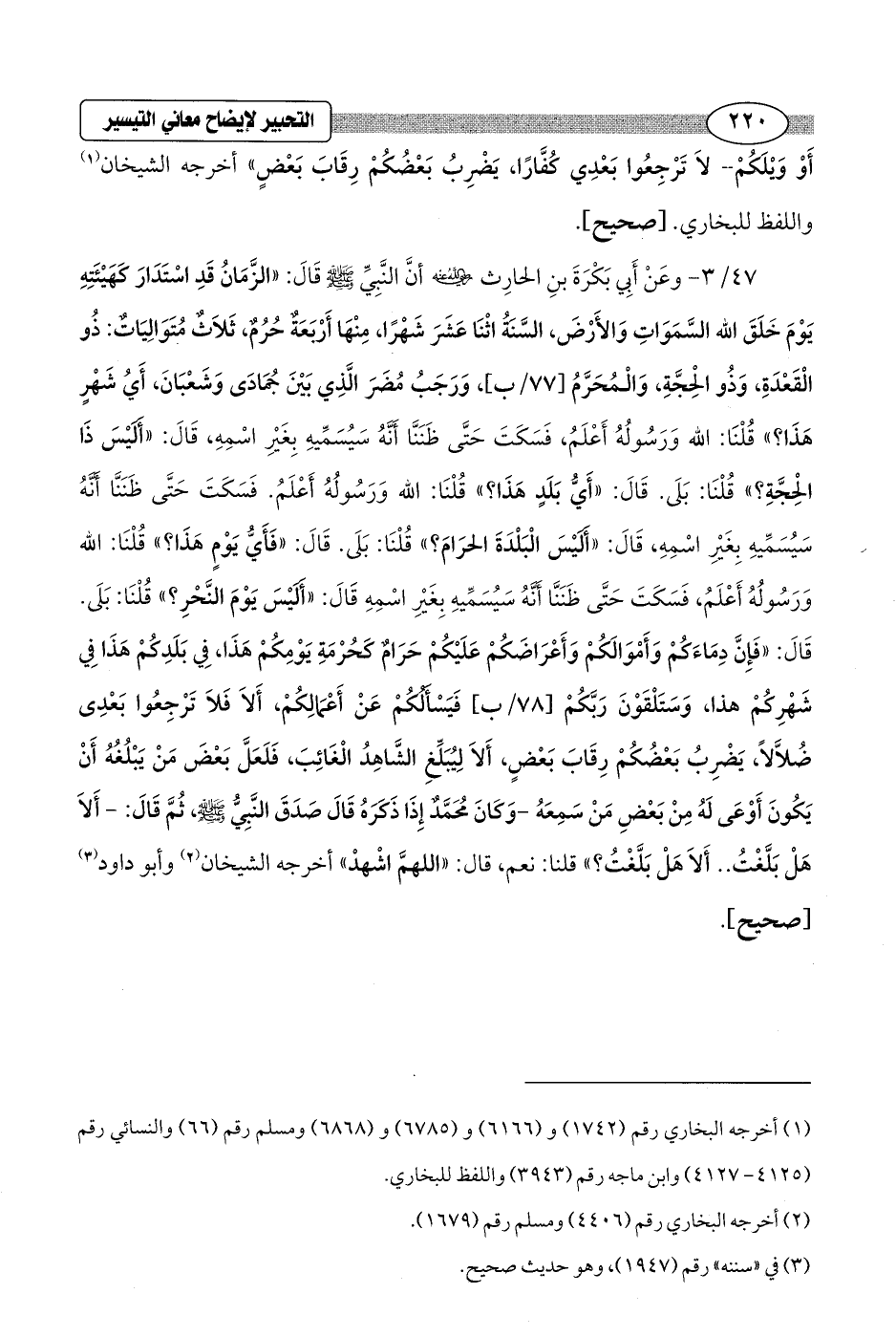 47/ 3 - وعَنْ أَبِي بَكْرَةَ بنِ الحارِث - رضي الله عنه - أنَّ النَّبِيِّ - صلى الله عليه وسلم - قَالَ: "الزَّمَانُ قَدِ اسْتَدَارَ كهَيْئَتِهِ يَوْمَ خَلقَ الله السَّمَوَاتِ وَالأرْضَ، السَّنَةُ اثْنَا عَشَرَ شَهْرًا، مِنهَا أَرْبَعَةٌ حُرُمٌ، ثَلاَثٌ مُتَوَالِيَاتٌ: ذُو الْقَعْدةِ وَذُو الْحِجَّةِ وَالْمُحَرَّمُ [77/ ب]، وَرَجَبُ مُضَرَ الَّذِي بيْنَ جُمَادَى وَشَعْبَانَ، أَيُ شَهْرٍ هَذَا؟ " قُلْنَا: الله وَرَسُولُهُ أَعْلَمُ، فَسَكَتَ حَتَّى ظَنَنَّا أَنَّهُ سَيُسَمِّيهِ بِغَيْرِ اسْمِهِ، قَالَ: "أَليْسَ ذَا الْحِجَّةِ؟ " قُلْنَا: بَلَى. قَالَ: "أَيُّ بَلَدٍ هَذَا؟ " قُلْنَا: الله وَرَسُولُهُ أَعْلَمُ. فَسَكَتَ حَتَّى ظَنَنَّا أنَّهُ سَيُسَمِّيهِ بِغَيْرِ اسْمِهِ، قَالَ: "أَليْسَ الْبَلْدَةَ الحرَامَ؟ " قُلْنَا: بَلَى. قَالَ: "فَأَيُّ يَوْمٍ هَذَا؟ " قُلْنَا: الله وَرَسُولُهُ أَعْلَمُ، فَسَكَتَ حَتَّى ظَنَنَّا أنهُ سَيُسَمِّيهِ بِغَيْرِ اسْمِهِ قَالَ: "أَلَيْسَ يَوْمَ النَّحْرِ؟ " قُلْنَا: بَلَى. قَالَ: "فَإِنَّ دِمَاءَكُمْ وَأَمْوَالَكُمْ وَأَعْرَاضَكُمْ عَلَيْكُمْ حَرَامٌ كَحُرْمَةِ يَوْمِكُمْ هَذَا، فِي بَلَدِكُمْ هَذَا فِي شَهْرِكُمْ هذا، وَسَتَلْقَوْنَ رَبَّكُمْ [78/ ب] فَيَسْأَلُكُمْ عَنْ أَعْمَالِكُمْ، أَلاَ فَلاَ تَرْجِعُوا بَعْدِى ضُلاَّلاً، يَضْرِبُ بَعْضُكُمْ رِقَابَ بَعْضٍ، أَلاَ لِيُبَلِّغِ الشَّاهِدُ الْغَائِبَ، فَلَعَلَّ بَعْضَ مَنْ يَبْلُغُهُ أَنْ يَكُونَ أَوْعَى لَهُ مِنْ بَعْضِ مَنْ سَمِعَهُ - وَكَانَ مُحَمَّدٌ إِذَا ذَكَرَهُ قَالَ صَدَقَ النَّبِيُّ - صلى الله عليه وسلم -، ثُمَّ قَالَ:- أَلاَ هَلْ بَلَّغْتُ .. أَلاَ هَلْ بَلَّغْتُ؟ " قلنا: نعم، قال: "اللهمَّ اشْهدْ" أخرجه الشيخان (¬2) وأبو داود (¬3) [صحيح].