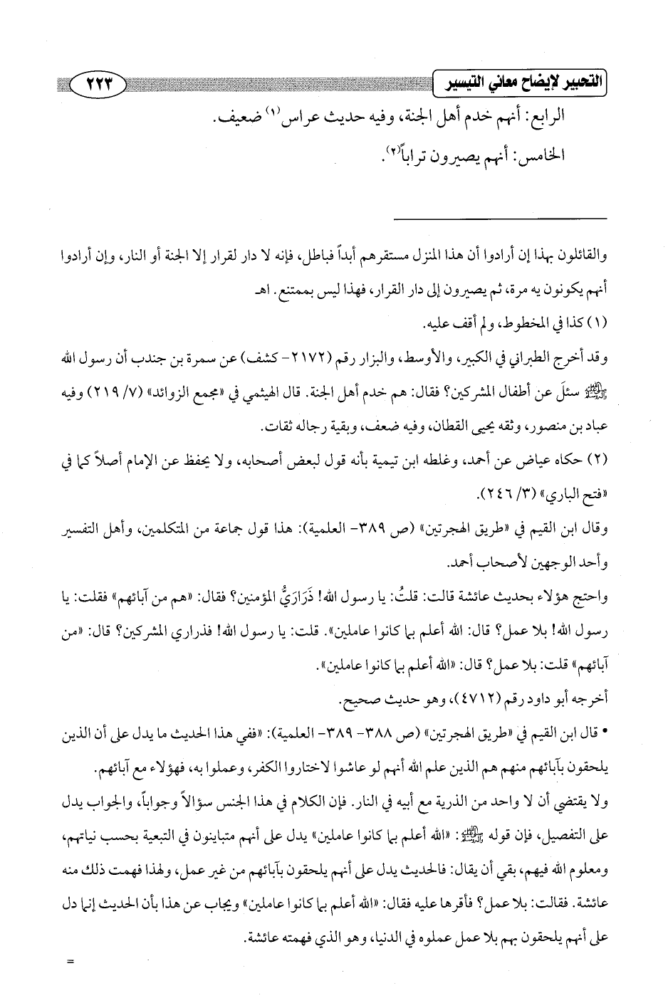 • قال ابن القيم في "طريق الهجرتين" (ص 388 - 389 - العلمية): "ففي هذا الحديث ما يدل على أن الذين يلحقون بآبائهم منهم هم الذين علم الله أنهم لو عاشوا لاختاروا الكفر، وعملوا به, فهؤلاء مع آبائهم. ولا يقتضي أن لا واحد من الذرية مع أبيه في النار. فإن الكلام في هذا الجنس سؤالاً وجواباً، والجواب يدل على التفصيل، فإن قوله - صلى الله عليه وسلم -: "الله أعلم بما كانوا عاملين" يدل على أنهم متباينون في التبعية بحسب نياتهم، ومعلوم الله فيهم، بقي أن يقال: فالحديث يدل على أنهم يلحقون بآبائهم من غير عمل، ولهذا فهمت ذلك منه عائشة. فقالت: بلا عمل؟ فأقرها عليه فقال: "الله أعلم بما كانوا عاملين" ويجاب عن هذا بأن الحديث إنما دل على أنهم يلحقون بهم بلا عمل عملوه في الدنيا، وهو الذي فهمته عائشة. =