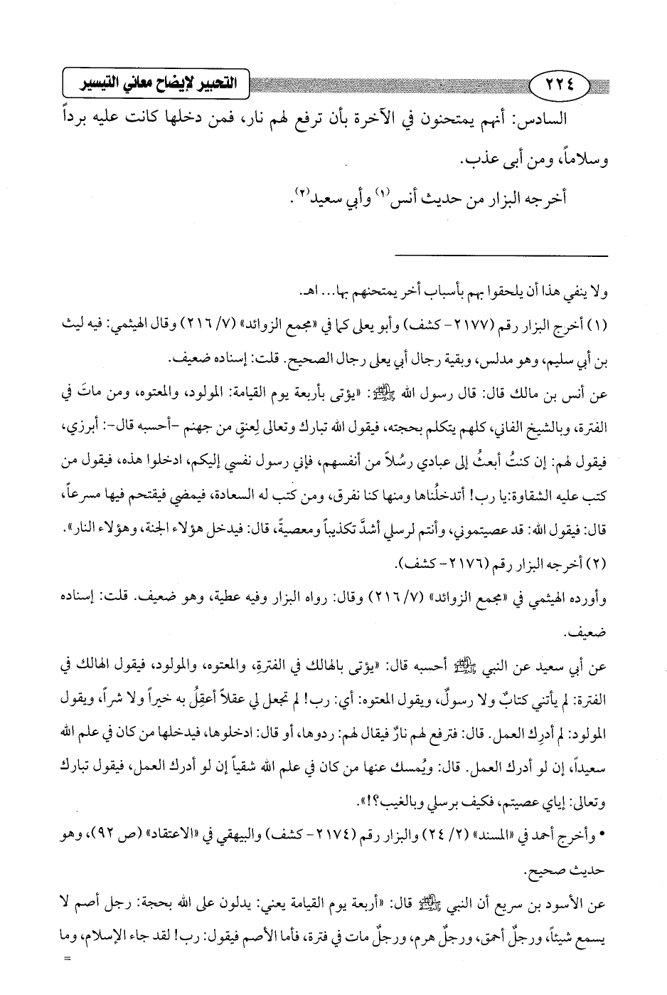 (¬1) أخرج البزار رقم (2177 - كشف) وأبو يعلى كما في "مجمع الزوائد" (7/ 216) وقال الهيثمي: فيه ليث بن أبي سليم، وهو مدلس، وبقية رجال أبي يعلى رجال الصحيح. قلت: إسناده ضعيف. عن أنس بن مالك قال: قال رسول الله - صلى الله عليه وسلم -: "يؤتى بأربعة يوم القيامة: المولود، والمعتوه، ومن ماتَ في الفترة، وبالشيخ الفاني، كلهم يتكلم بحجته فيقول الله تبارك وتعالى لِعنقٍ من جهنم - أحسبه قال -: أبرزي، فيقول لهم: إن كنتُ أبعثُ إلى عبادي رسُلاً من أنفسهم، فإني رسول نفسي إليكم، ادخلوا هذه, فيقول من كتب عليه الشقاوة: يا رب! أتدخلُناها ومنها كنا نفرق، ومن كتب له السعادة، فيمضي فيقتحم فيها مسرعاً، قال: فيقول الله: قد عصيتموني، وأنتم لرسلي أشدَّ تكذيباً ومعصيةً، قال: فيدخل هؤلاء الجنة، وهؤلاء النار".