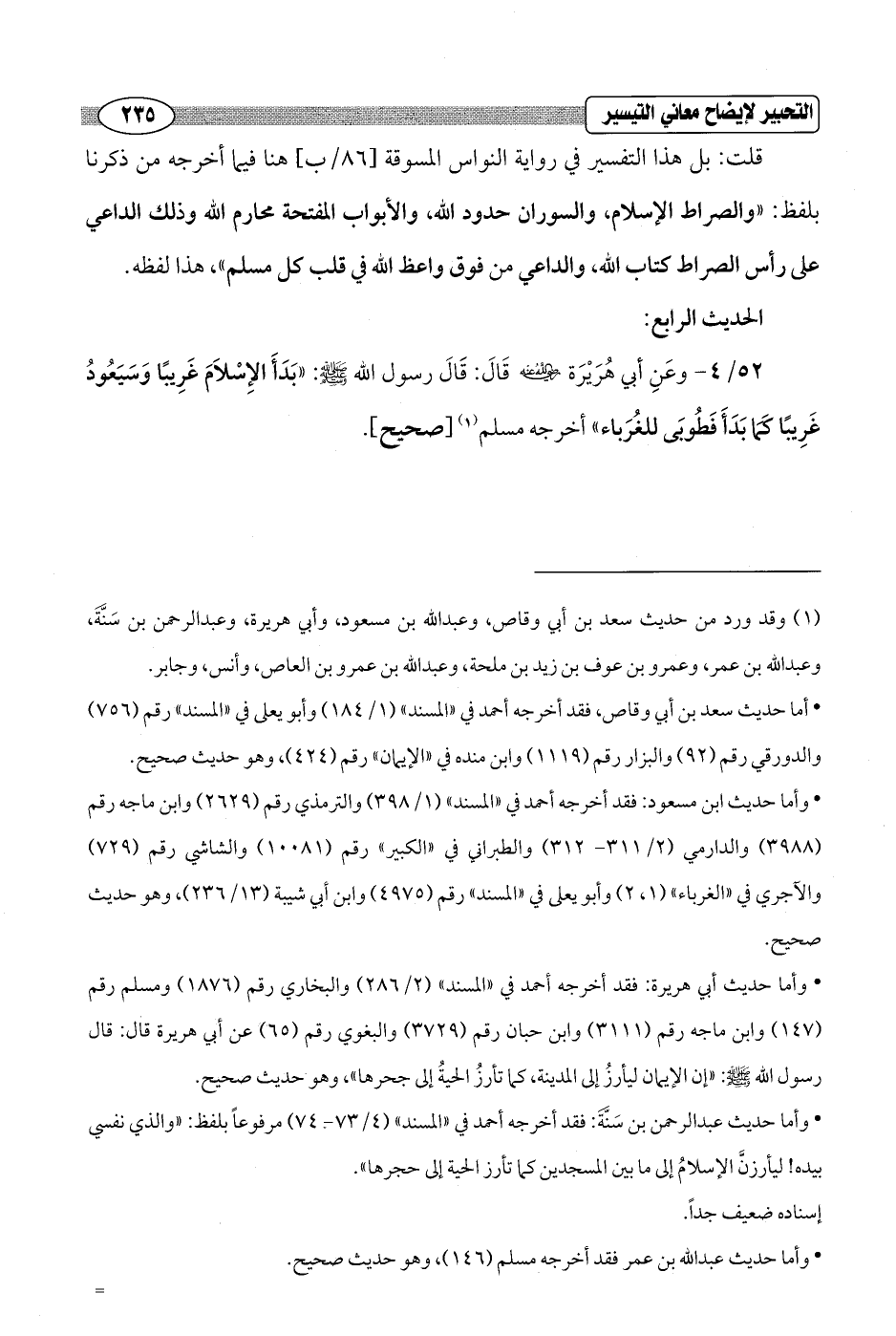 52/ 4 - وعَنِ أبي هُرَيْرَة - رضي الله عنه - قَالَ: قَالَ رسول الله - صلى الله عليه وسلم -: "بَدَأَ الإِسْلاَمَ غَرِيبًا وَسَيَعُودُ غَرِيبًا كما بَدَأَ فَطُوبَى للغُرَباء" أخرجه مسلم (¬1) [صحيح].