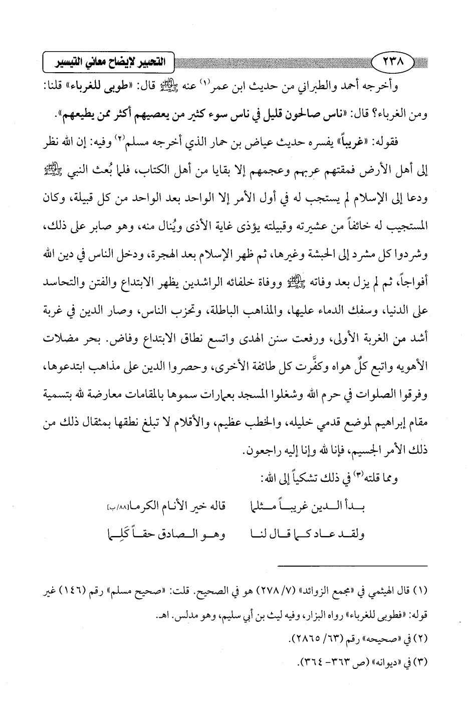 فقوله: "غريباً" يفسره حديث عياض بن حمار الذي أخرجه مسلم (¬2) وفيه: إن الله نظر إلى أهل الأرض فمقتهم عربهم وعجمهم إلا بقايا من أهل الكتاب، فلما بُعث النبي - صلى الله عليه وسلم - ودعا إلى الإسلام لم يستجب له في أول الأمر إلا الواحد بعد الواحد من كل قبيلة، وكان المستجيب له خائفاً من عشيرته وقبيلته يؤذى غاية الأذى ويُنال منه، وهو صابر على ذلك، وشردوا كل مشرد إلى الحبشة وغيرها، ثم ظهر الإسلام بعد الهجرة، ودخل الناس في دين الله أفواجاً، ثم لم يزل بعد وفاته - صلى الله عليه وسلم - ووفاة خلفائه الراشدين يظهر الابتداع والفتن والتحاسد على الدنيا، وسفك الدماء عليها، والمذاهب الباطلة، وتحزب الناس، وصار الدين في غربة أشد من الغربة الأولى، ورفعت سنن الهدى واتسع نطاق الابتداع وفاض. بحر مضلات الأهويه واتبع كلٌ هواه وكفَّرت كل طائفة الأخرى، وحصروا الدين على مذاهب ابتدعوها، وفرقوا الصلوات في حرم الله وشغلوا المسجد بعمارات سموها بالمقامات معارضة لله بتسمية مقام إبراهيم لموضع قدمي خليله، والخطب عظيم، والأقلام لا تبلغ نطقها بمثقال ذلك من ذلك الأمر الجسيم، فإنا لله وإنا إليه راجعون.