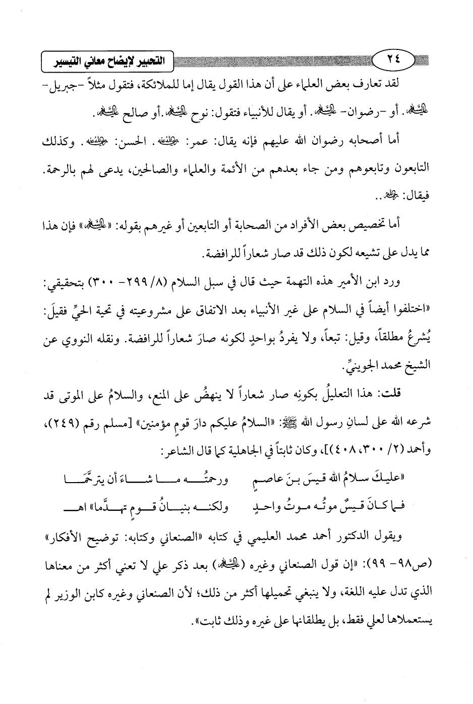 ويقول الدكتور أحمد محمد العليمي في كتابه "الصنعاني وكتابه: توضيح الأفكار" (ص 98 - 99): "إن قول الصنعاني وغيره (- عليه السلام -) بعد ذكر علي لا تعني أكثر من معناها الذي تدل عليه اللغة، ولا ينبغي تحميلها أكثر من ذلك؛ لأن الصنعاني وغيره كابن الوزير لم يستعملاها لعلي فقط، بل يطلقانها على غيره وذلك ثابت".