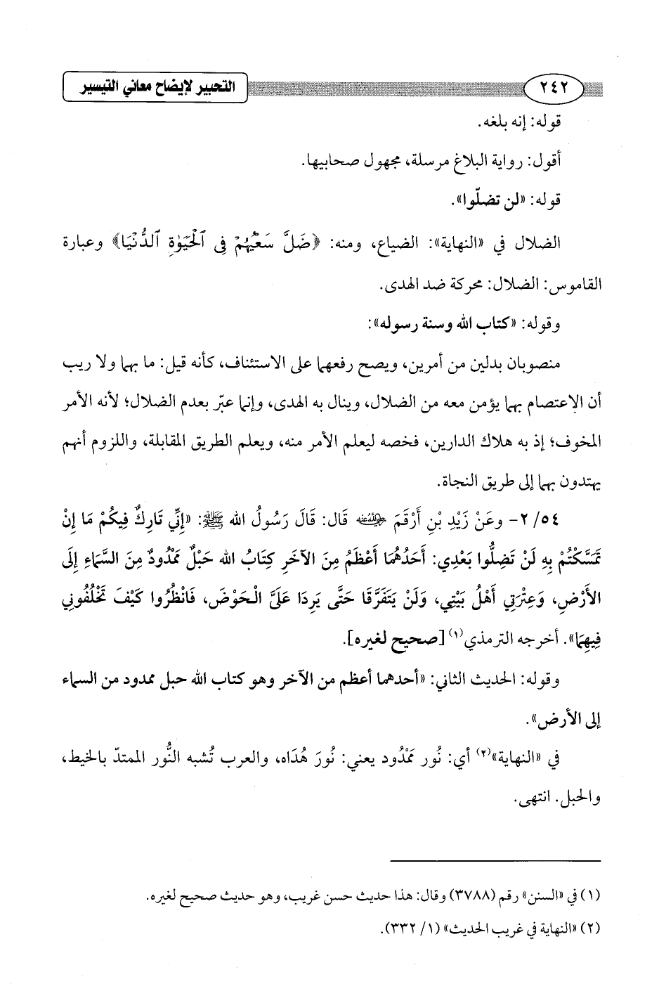 54/ 2 - وعَنْ زَيْدِ بْنِ أَرْقَمَ - رضي الله عنه - قَالَ: قَالَ رَسُولُ الله - صلى الله عليه وسلم -: "إِنِّي تَارِكٌ فِيكُمْ مَا إِنْ تَمَسَّكْتُمْ بِهِ لَنْ تَضِلُّوا بَعْدِي: أَحَدُهُمَا أَعْظَمُ مِنَ الآخَرِ كِتَابُ الله حَبْلٌ مَمدُودٌ مِنَ السَّمَاءِ إِلَى الأَرْضِ، وَعِتْرَتِي أَهْلُ بَيْتِي، وَلَنْ يَتَفَرَّقَا حَتَّى يَرِدَا عَلَىَّ الْحَوْضَ، فَانْظُرُوا كيْفَ تَخْلُفُونِي فِيهَما". أخرجه الترمذي (¬1) [صحيح لغيره].