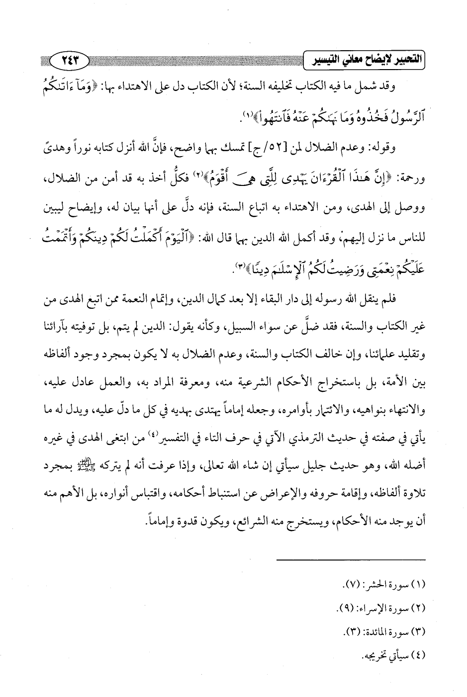 وقوله: وعدم الضلال لمن [52/ ج] تمسك بهما واضح، فإنَّ الله أنزل كتابه نوراً وهدىً ورحمة: {إِنَّ هَذَا الْقُرْآنَ يَهْدِي لِلَّتِي هِيَ أَقْوَمُ} (¬2) فكلُّ أخذ به قد أمن من الضلال، ووصل إلى الهدى، ومن الاهتداء به اتباع السنة، فإنه دلَّ على أنها بيان له، وإيضاح ليبين للناس ما نزل إليهم، وقد أكمل الله الدين بهما قال الله: {الْيَوْمَ أَكْمَلْتُ لَكُمْ دِينَكُمْ وَأَتْمَمْتُ عَلَيْكُمْ نِعْمَتِي وَرَضِيتُ لَكُمُ الْإِسْلَامَ دِينًا} (¬3).